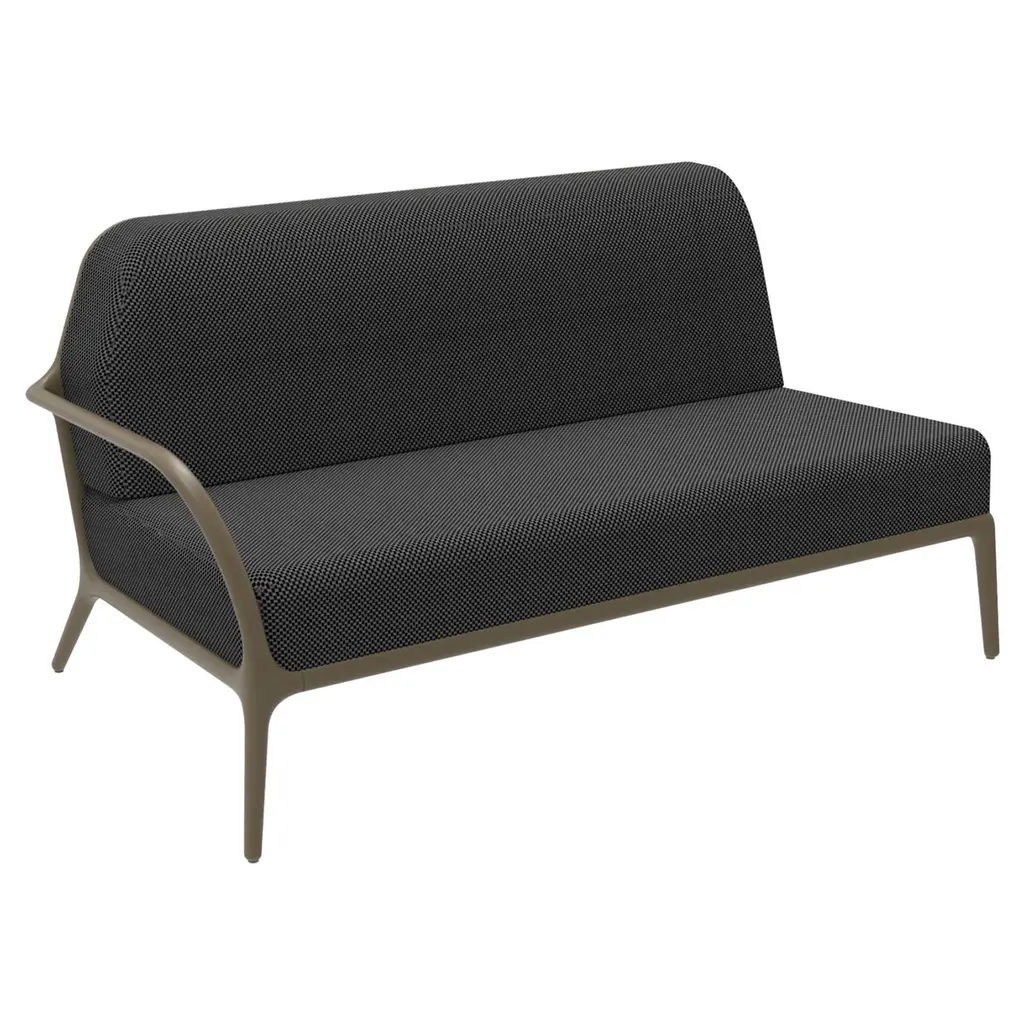 Xaloc left 160 gold modular sofa by mowee dimensions: d100 x w160 x h81 cm (seat height 42cm) material: aluminium, textile weight: 37 kg may be available separately in different colors and finishes. Xaloc synthesizes the lines of interior furniture to extrapolate to the exterior, creating an elegant and versatile collection that can coexist in both contexts. The textile of its elements also want to represent this concern to provide the exterior with the warmth of the interior furniture.