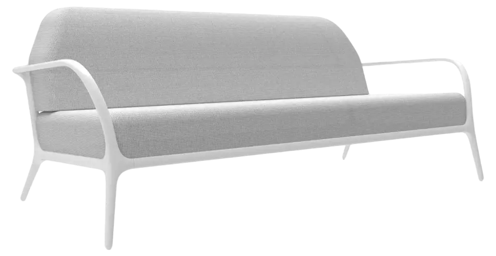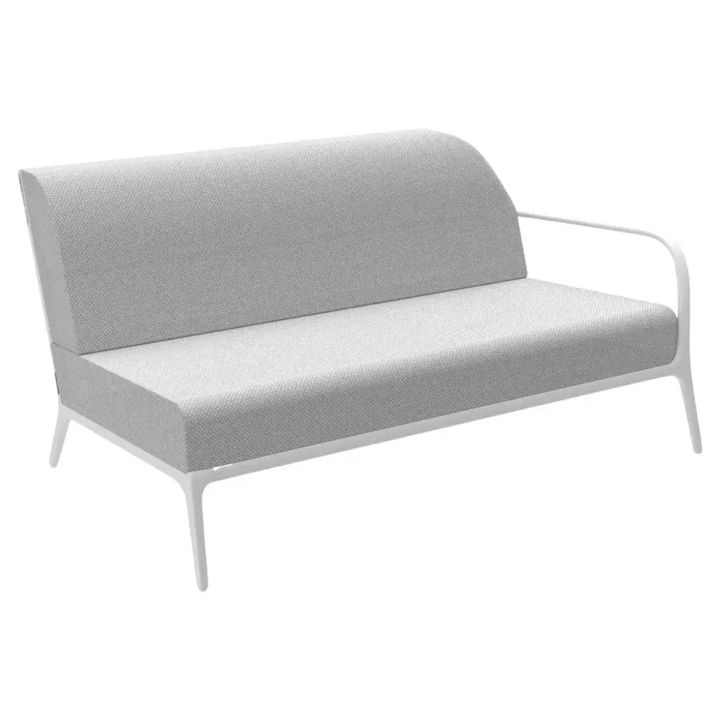 Xaloc left 160 white modular sofa by mowee dimensions: d100 x w160 x h81 cm (seat height 42cm) material: aluminium, textile weight: 37 kg also available in different colors and finishes. Xaloc synthesizes the lines of interior furniture to extrapolate to the exterior, creating an elegant and versatile collection that can coexist in both contexts. The textile of its elements also want to represent this concern to provide the exterior with the warmth of the interior furniture. The name xaloc comes from the wind with the same name. A strong wind typical of the mediterranean area. A wind capable of eroding the environment it meets. The shapes of the collection represent this wind-induced erosion that generates natural and harmonic forms.