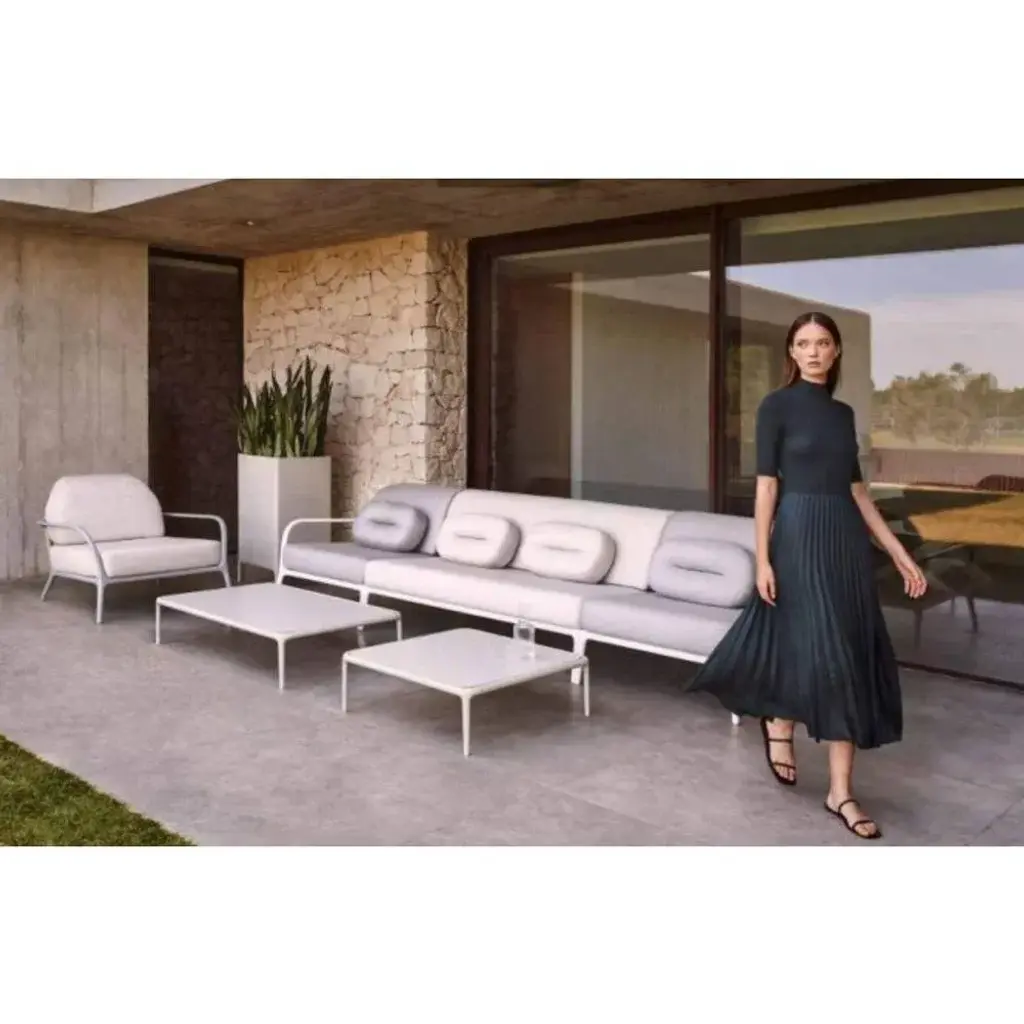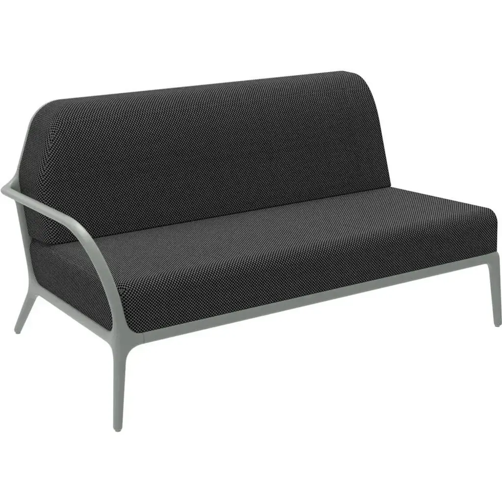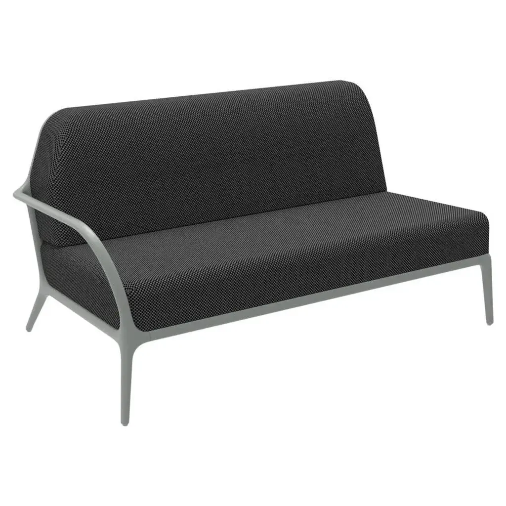 Xaloc right 160 silver modular sofa by mowee dimensions: d100 x w160 x h81 cm (seat height 42 cm) material: aluminium, textile weight: 37 kg also available in different colours and finishes. Xaloc synthesizes the lines of interior furniture to extrapolate to the exterior, creating an elegant and versatile collection that can coexist in both contexts. The textile of its elements also want to represent this concern to provide the exterior with the warmth of the interior furniture. The name xaloc comes from the wind with the same name. A strong wind typical of the mediterranean area. A wind capable of eroding the environment it meets. The shapes of the collection represent this wind-induced erosion that generates natural and harmonic forms.