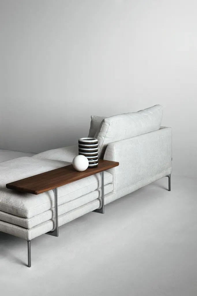 Zanotta William Modular Sofa in Vins Fabric and Steel Frame by Damian WilliamsonThese modular elements allow many corner or straight compositions. Aluminum alloy feet, either polished or with natural or black nickel-satin finish, or black painted. Steel frame. Elastic strips suspension. Seat upholstered with polyurethane/heat-bound polyester fibre. Backrest upholstered with self-extinguishing polyurethane foam/ heatbound polyester fibre. Seat cushion upholstered with goose feathers – 100% pure material. Back cushion upholstered with goose feathers – 100% pure material. Fixed internal nylon cover and cotton cover for the cushions. Removable external cover in fabric or leather. The lounge chairs without armrest are fit to arrange on their longer side a solid wood shelf , in natural or grey painted oak or in natural painted Canaletto walnut. Shelf supports in polished, with natural or black nickel-satin finish, or black painted aluminum. The lounge chair 1330/AL3 is foreseen to be arranged in line with the end-sofas, as shown in the composition no. 1.Additional Information:Material: Upholstery, aluminum, walnutUpholstery: Vins, cat. 20, 27756Frame finish: Polished aluminumWood finish: WalnutDimensions: 310 W x 160 D x 87 H cmSeating height: 43Available in other upholstery options: Cat. 30, Cat. 40, Leather 90, Leather 95, Leather 98, Leather 99Available in other frame finish options: Natural, black nickel-satin, black paintedAvailable in other wood finish option: OakAvailable in other structural options