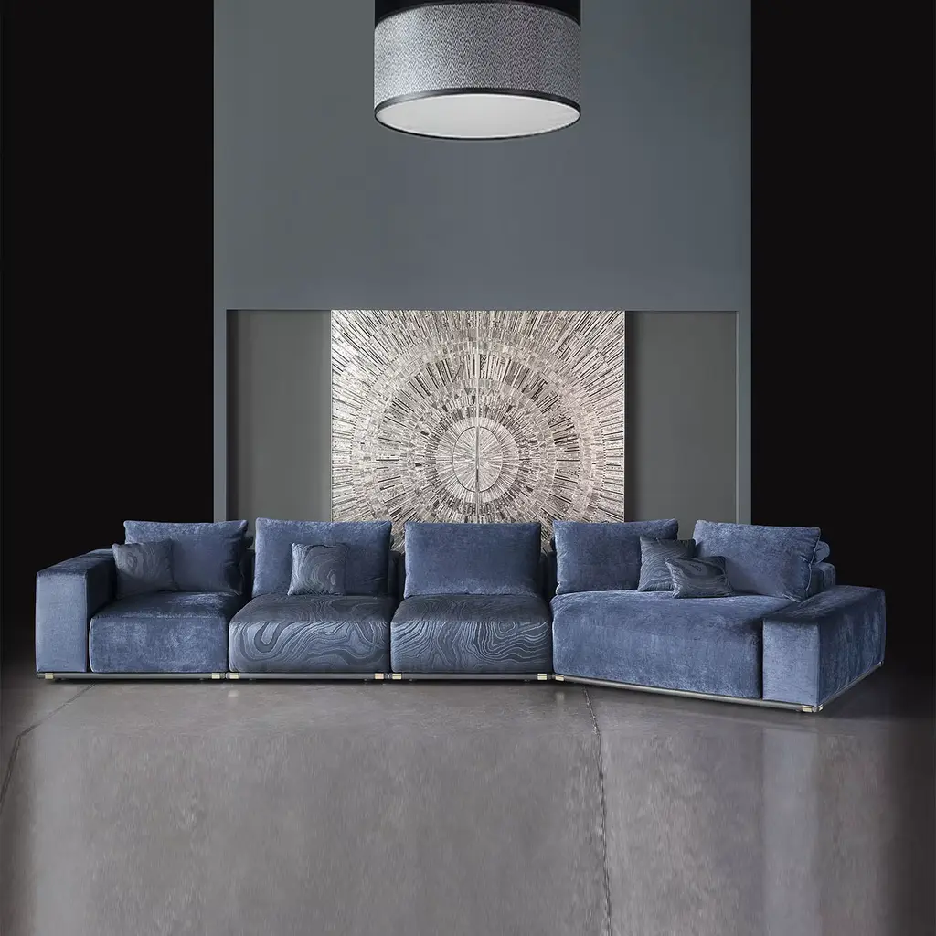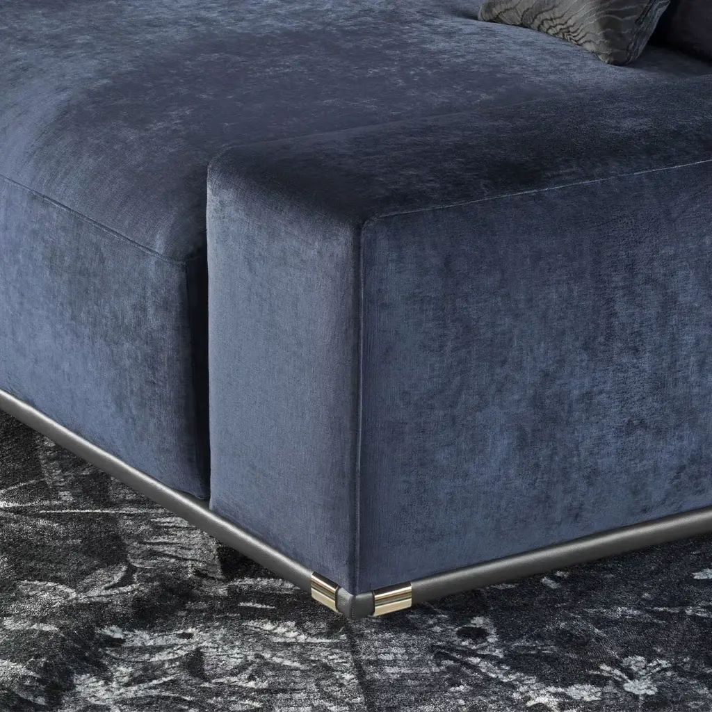 An invitation to enjoy moments of pure relaxation, this sofa boasts a modular design where the rigor of lines coexists with the plushness of its richly padded volumes. The base is lined with Oregon Black leather and upholstered in a combination of blue-hued Agata and Elios fabrics, complemented by the glossy champagne-finished metal details. Pricing does not include cushions.