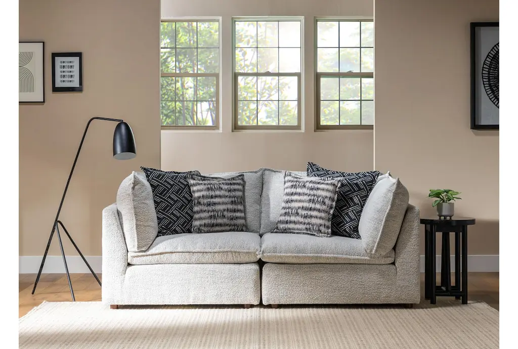Upgrade your living space with the Weekend White Performance Fabric 2 Piece Modular Loveseat. This modern loveseat features a versatile design that fits seamlessly into any living room setup. The cotton-colored fabric is made from 100% polyester, ensuring durability and comfort for everyday use.