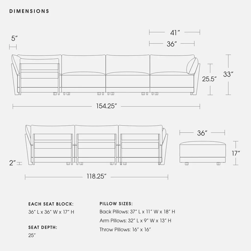 Features Custom Cloud-like Comfort: Oversized cushions, an extra deep seat, a tapered, cradled recline, and a comfort-centric webbing system—Bondi is designed for lavish comfort from the ground up. Choose between our two best selling comfort recipes to find the custom formula that’s right for you. Washable Covers: The entire Bondi Sofa can be undressed and washed with our patent pending design. All fabric covers feature concealed zippers for easy removal and cleaning. Extra slipcovers are available for purchase. Life-Proof Seating: Designed to handle everything from dirty paws to sharp claws, our fabric collection includes high performance options that are Machine Washable, Liquid Repellent, Stain Resistant, & Pet-Friendly. Each pillow is wrapped in a patent pending, water-resistant liner and each seat cushion features moisture-wicking air mesh for additional protection. Modular: Reconfigurable, patent pending modules, made to move and adapt with your ever-changing lifestyle. Designed to fit anywhere—great for small & large spaces alike. Sustainable Craftsmanship: Bondi’s kiln-dried solid ash wood frame is FSC-Certified. Our comfort formulas feature low impact eco-foam that upcycles disposable bottles. One sofa = roughly 400 recycled plastic bottles. All foam is CertiPUR-US®, free of ozone depletors.