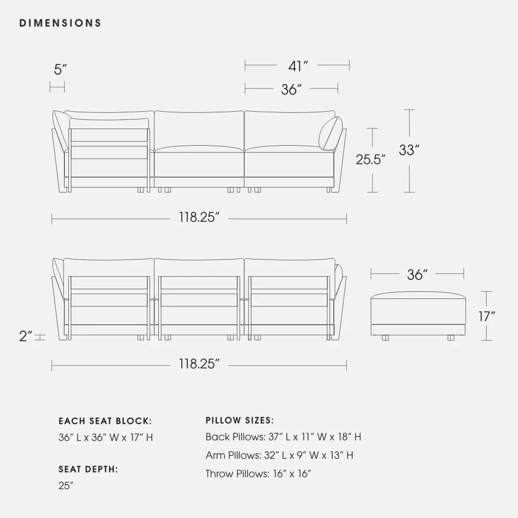 Features Custom Cloud-like Comfort: Oversized cushions, an extra deep seat, a tapered, cradled recline, and a comfort-centric webbing system—Bondi is designed for lavish comfort from the ground up. Choose between our two best selling comfort recipes to find the custom formula that’s right for you. Washable Covers: The entire Bondi Sofa can be undressed and washed with our patent pending design. All fabric covers feature concealed zippers for easy removal and cleaning. Extra slipcovers are available for purchase. Life-Proof Seating: Designed to handle everything from dirty paws to sharp claws, our fabric collection includes high performance options that are Machine Washable, Liquid Repellent, Stain Resistant, & Pet-Friendly. Each pillow is wrapped in a patent pending, water-resistant liner and each seat cushion features moisture-wicking air mesh for additional protection. Modular: Reconfigurable, patent pending modules, made to move and adapt with your ever-changing lifestyle. Designed to fit anywhere—great for small & large spaces alike. Sustainable Craftsmanship: Bondi’s kiln-dried solid ash wood frame is FSC-Certified. Our comfort formulas feature low impact eco-foam that upcycles disposable bottles. One sofa = roughly 400 recycled plastic bottles. All foam is CertiPUR-US®, free of ozone depletors.