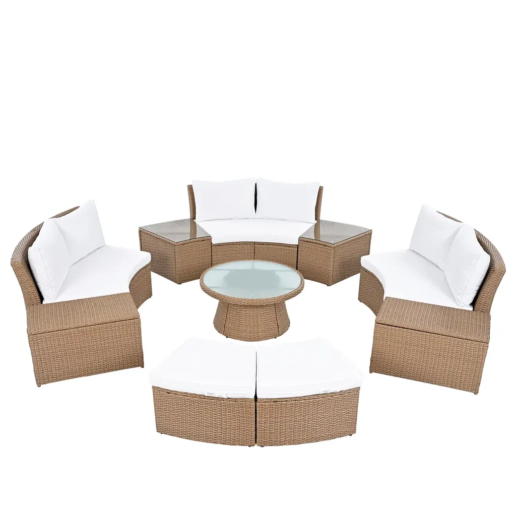 Compared with others, our cushions for the section This patio sofa set includes 3pcs 2-person loveseats, 2pcs side tables with glass top, 2pcs storage boxes, 2pcs ottomans and 1pc round table as well as 8 thick seat cushions&6 back cushions. Constructed with solid steel frame, each loveseat can hold up to 800lbs and each ottoman 400lbs. This patio sofa set includes 3pcs 2-person lovesea Modern and tempered glass table top make this wicker dining set look pretty fashionable, allowing you to place drinks, meals and other accessories on top. And you can clean it easily with just a wipe when there is water strain on it. Comfortable Upgraded Pillows and Cushions Compared with others, our cushions for the sectional rattan furniture are up to 3.15inch thickness. For all pillows and cushions, they are come with pillows so that the covers can be removed easily for washing. Weight&Dimensions&Specifications Overall Product Dimension Loveseat: 32.28x27.95x28.74inch(LXWXH); Side Table: 14.17x24.8x23.22inch(LXWXH); Round Table: dia31.89x15.94inch(dia x H); Storage Box: 16.14x27.95x16.54inch(LXWXH); Ottoman: 23.62x18.11x13.39inch(LXWXH); Cushion Thickness: 3.15inch Overall Weight Loveseat Net Weight: 34.17 lbs Side Table Net Weight: 17.64lbs Storage Box Net Weight: 13.23lbs Ottoman Net Weight: 9.92lbs Round Table Net Weight: 24.25lbs Weight Capacity Loveseat : 800 lbs Side Table : 176lbs Storage Box : 176lbs Ottoman: 400lbs Round Table: 176lbs Material PE Rattan+Steel+polyester fabric+foam Pieces Included 3*loveseat+2*side table+2*storage box+2*ottoman+1*round table+ 8*seat cushions+6*back cushions Color White Assembly Required Yes Additional Tools Required All Tools Included Country of Origin Vietnam Product Warrant Please Read Return Policy Maintenance&Notice Outdoor Furniture Care To remove dirt and debris, vacuum with a dust- brush attachment or use a dry paintbrush. Clean with a mild soap solution, scrub with a sponge, rinse with cold water and dry completely. When outdoor furniture is not in use, we recommend covering all the furniture to protect it against the elements. Assembly Notice Please read assemble manual in advance. Please do not over-tighten nuts, as this may cause distortion or breakage. Color Notice Items may slightly differ from photo in terms of color due to the lighting or your monitor's display. Size Notice Manual measurement has been used, there may be some reasonable error.