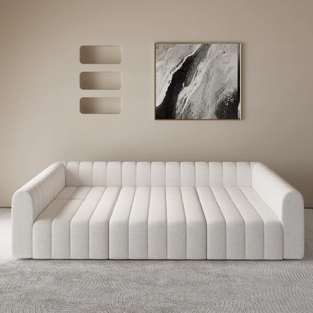 The 118.9" modular sectional sofa set with plush velvet upholstery and composed convertible sections to fit any living space. Its modular design enables different configurations for a perfect fit in any room. Perfect for large living rooms, this sectional can be an inviting centerpiece to provide style and functionality in comfortable lounging.