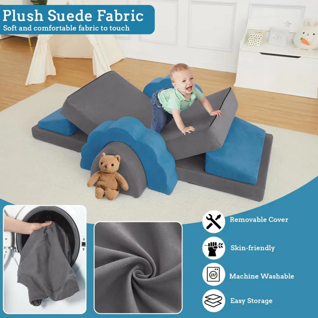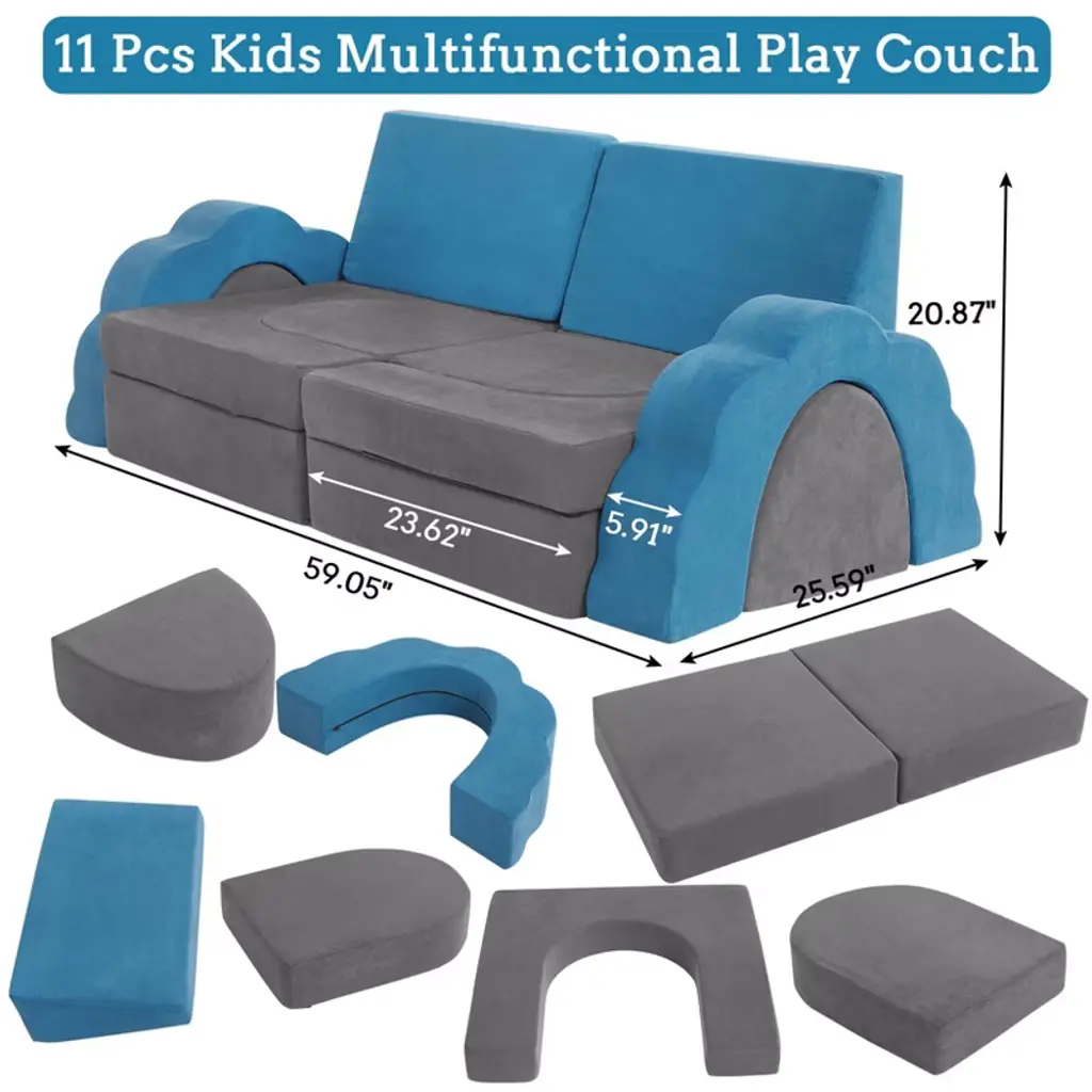 Spark your child¡¯s imagination with this 11-piece modular kids play couch, designed for endless creative fun. Featuring a mix of foam pieces in lake blue and grey, it transforms effortlessly from a cozy seating spot into forts, playhouses, reading nooks, or stores¡ªlimited only by imagination. The set includes larger, dense foam pieces that are sturdy enough for building while remaining lightweight, so kids can rearrange them independently. Soft suede covers add comfort, and the modern design fits seamlessly into playrooms or bedrooms. Perfect for encouraging active play, storytelling, or quiet relaxation. Dimensions: Thick Connected Base: 48"" L x 24"" W x 4"" H Tall Arches/Doors (2 pcs): 24"" H x 18"" W x 4"" D each Versatile Trapezoids (2 pcs): 20"" L x 12"" W x 4"" H each (sloped side: 15"" length) Half-Moon Rockers (2 pcs): 24"" W x 12"" D x 4"" H each (curved edge radius: 12"") Flower-Shape Arches (2 pcs): 18"" W x 12"" H x 4"" D each (petal design: 6 petals per arch) Total Set Weight: 35 Pounds Individual Piece Weight: 2.5 - 6 Pounds (base is heaviest) Material: High-density foam (core); soft suede fabric (covers, 100% polyester); YKK zippers (for cover removal) Age Recommendation: 3 - 8 years Weight Capacity per Piece: 110 lb What You Get: 1 thick connected foam base 2 tall arch/door foam pieces 2 versatile trapezoid foam pieces 2 half-moon rocker foam pieces 2 flower-shape arch foam pieces 11 removable and machine-washable suede covers (one per foam piece) Instruction manual with assembly tips and creative configuration ideas Care card for foam and fabric maintenance