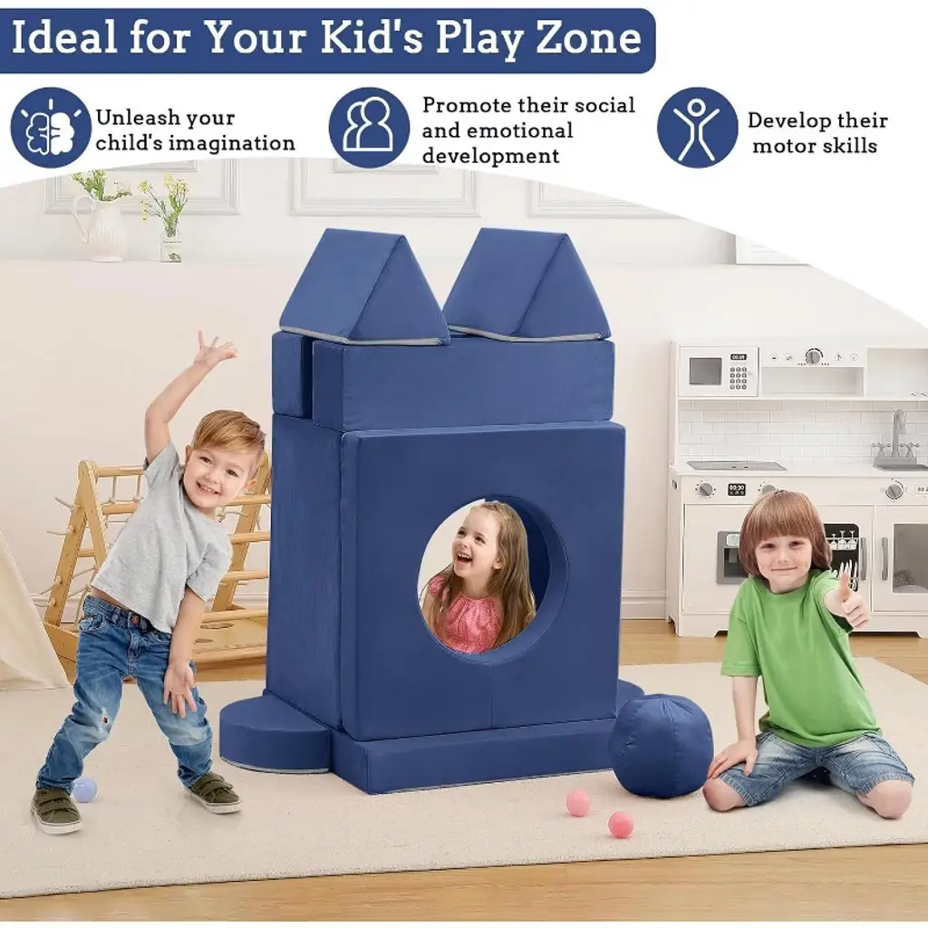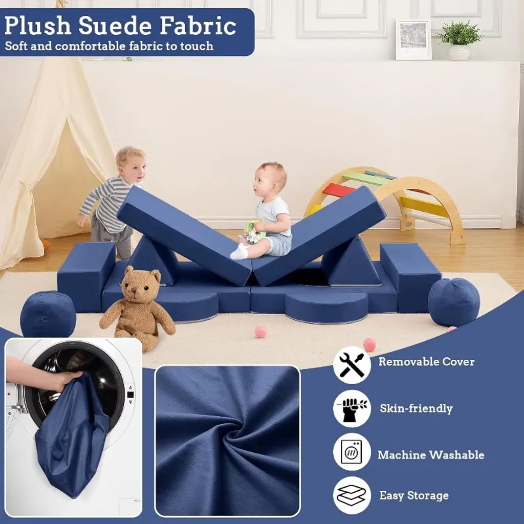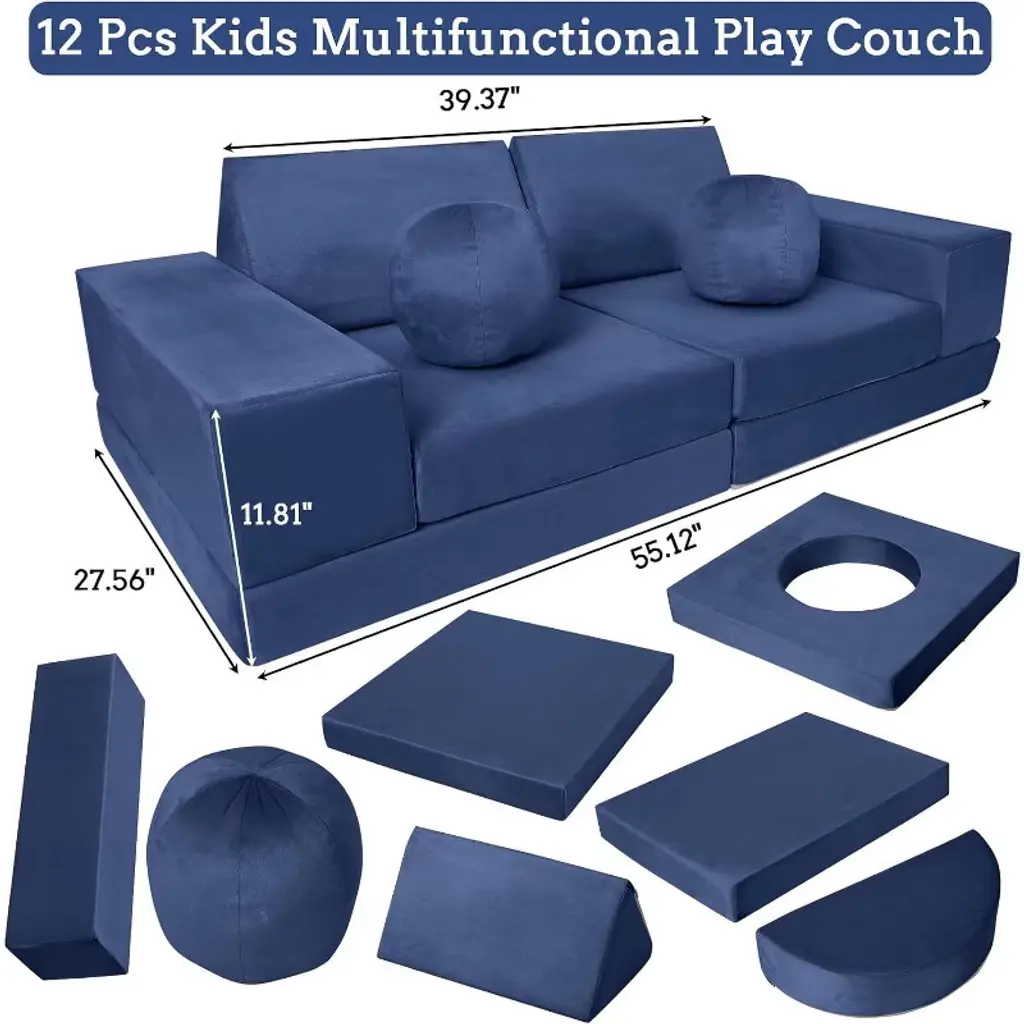 Feature:Comprehensive design of the toddler couch provides a comfortable and practical seating option for kids, encouraging play, creativity, and development in a safe and inviting space.1.The material used in the sectional sofa is comfortable and long-lived, with soft fabric which is resistant to shrinking, fading, shedding and anti-tension stitching prevents bursting at the seams.2.The modular kids couch is filled with high-resilience and high-density sponges, ensuring it maintains its shape and supportiveness even with frequent use.3.The kids' sofa is easy to clean, with a soft slipcover featuring smooth zippers for effortless removal and washing.4.The modular kids play couch encourages interactive play and collaboration among kids, can promote social and emotional development, spark imagination, and aid in the development of motor skills. Specification:Material: Polyester Suede Fabric/FoamOverall size: 55.12’’W×27.56’’D×11.81’’HLength of backrest: 39.37’’Application:Playroom/Bedroom/Living Room Packing list:1×arched pad2×balls2×semi-circular cushions2×triangular cushions2×rectangular armrests3×square cushions Note:To ensure the product is more complete, the kids couch undergoes a compressed process. When you receive the toddler couch, it may appear thin and small due to this compression. You simply need to disassemble the packaging bag and allow the couch to expand and return to its original appearance over time.