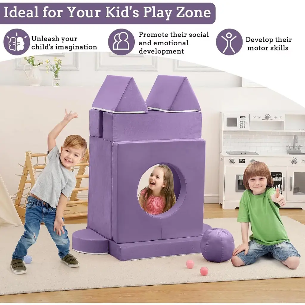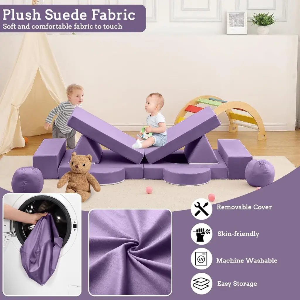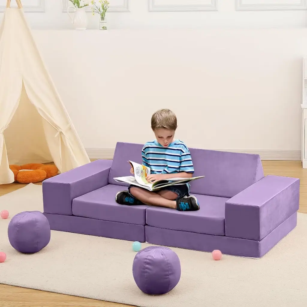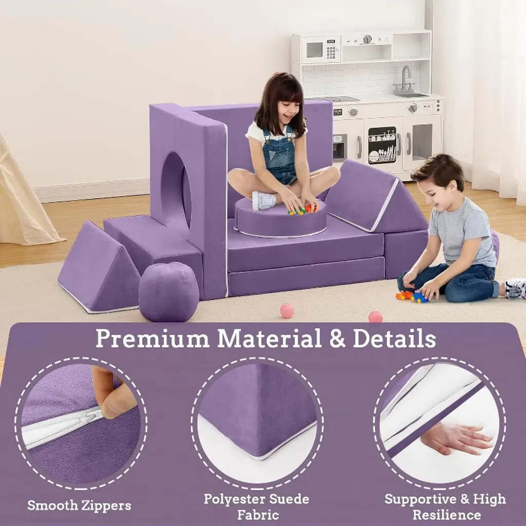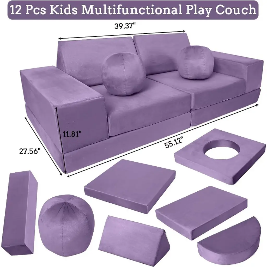 Feature:Comprehensive design of the toddler couch provides a comfortable and practical seating option for kids, encouraging play, creativity, and development in a safe and inviting space.1.The material used in the sectional sofa is comfortable and long-lived, with soft fabric which is resistant to shrinking, fading, shedding and anti-tension stitching prevents bursting at the seams.2.The modular kids couch is filled with high-resilience and high-density sponges, ensuring it maintains its shape and supportiveness even with frequent use.3.The kids' sofa is easy to clean, with a soft slipcover featuring smooth zippers for effortless removal and washing.4.The modular kids play couch encourages interactive play and collaboration among kids, can promote social and emotional development, spark imagination, and aid in the development of motor skills. Specification:Material: Polyester Suede Fabric/FoamOverall size: 55.12’’W×27.56’’D×11.81’’HLength of backrest: 39.37’’Application:Playroom/Bedroom/Living Room Packing list:1×arched pad2×balls2×semi-circular cushions2×triangular cushions2×rectangular armrests3×square cushions Note:To ensure the product is more complete, the kids couch undergoes a compressed process. When you receive the toddler couch, it may appear thin and small due to this compression. You simply need to disassemble the packaging bag and allow the couch to expand and return to its original appearance over time.