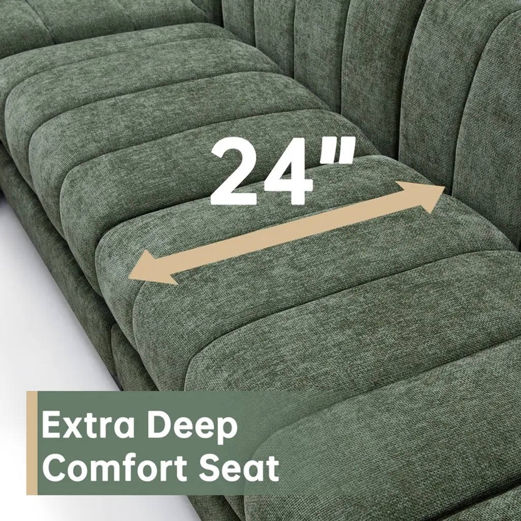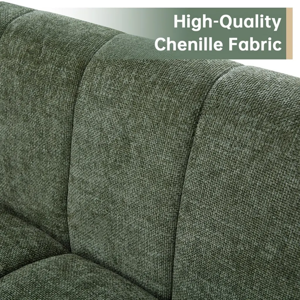 Transform your living space with this stunning sectional sofa, a perfect blend of modern design and luxurious comfort. Upholstered in luxurious chenille, it features deep, plush cushions and striking channel tufting, offering a perfect blend of elegance and coziness. The muted green hue adds a subtle pop of color, while the low-profile silhouette and sturdy dark base make it a versatile choice for any decor. Ideal for lounging, this sofa brings a contemporary touch to any room.