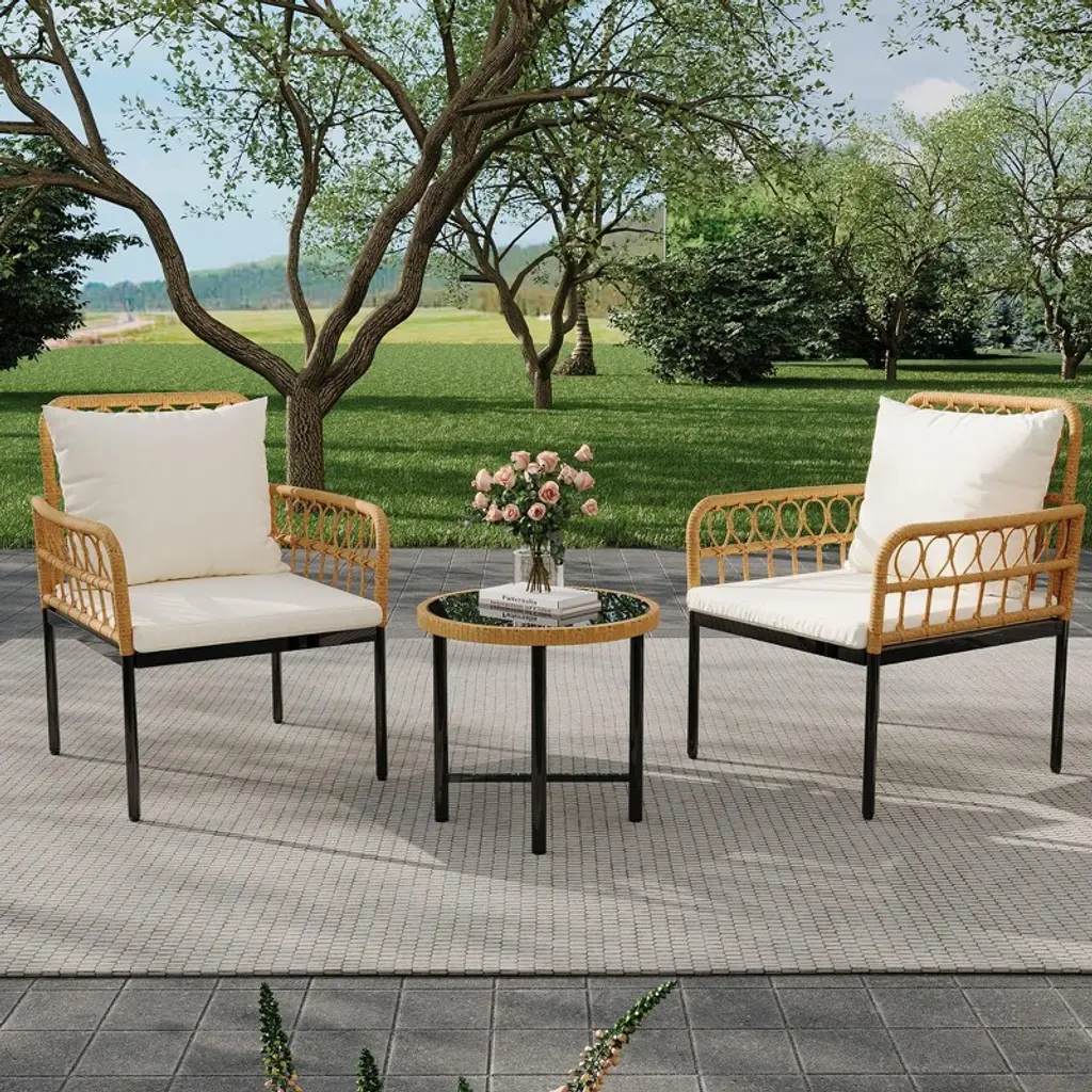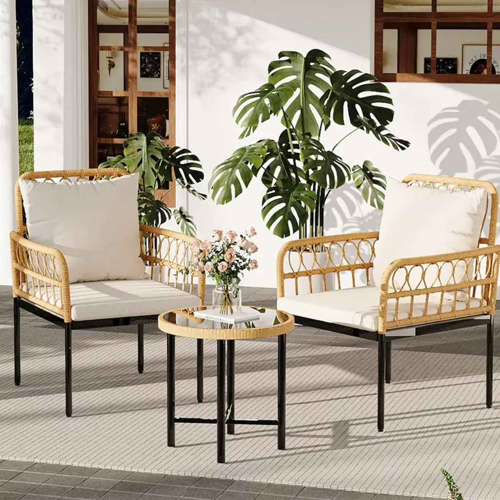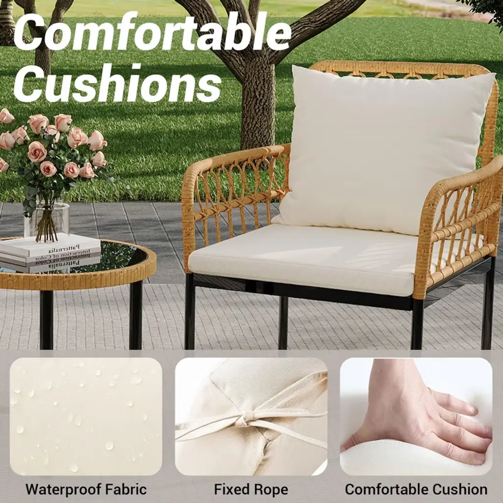 3-piece Outdoor Patio Furniture Set, All-weather Boho Rattan Sectional Sofa With Table & Metal Frame, Detachable Cushions, For Patio, Beige