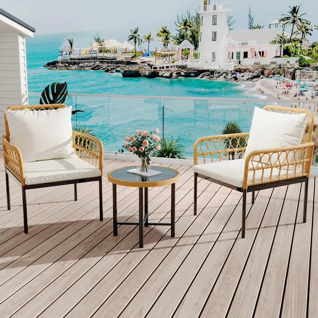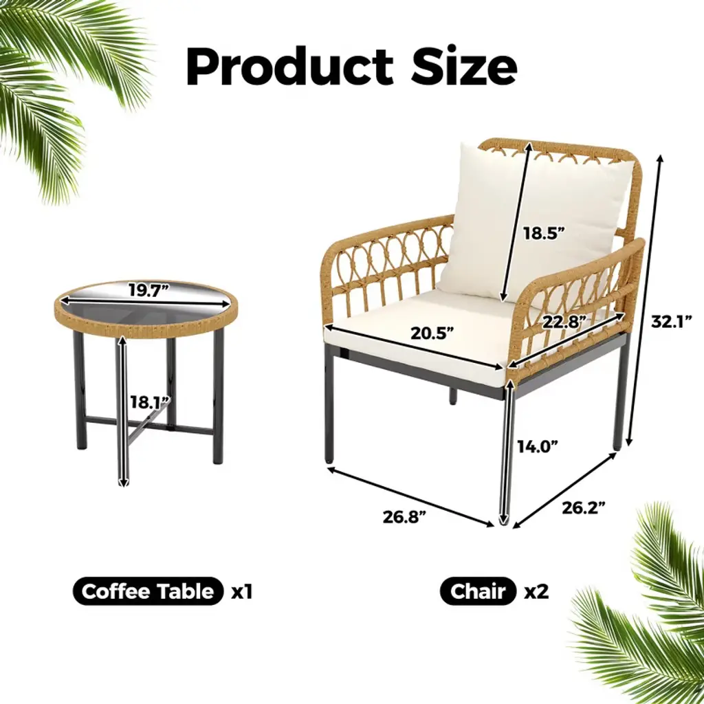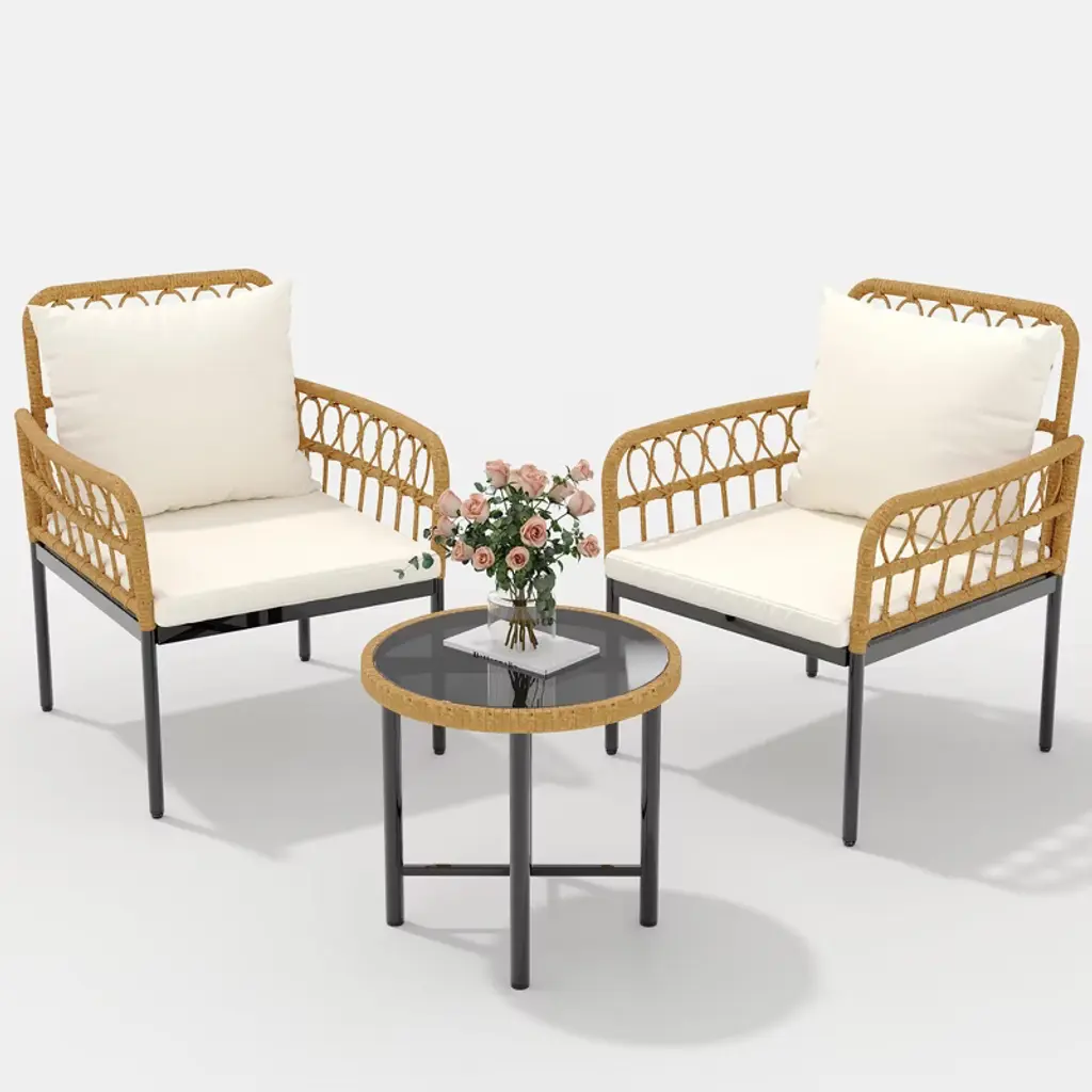 3-piece Outdoor Patio Furniture Set, All-weather Boho Rattan Sectional Sofa With Table & Metal Frame, Detachable Cushions, For Patio, Beige