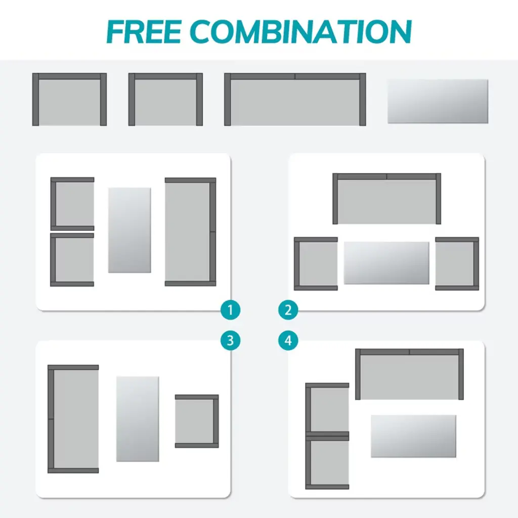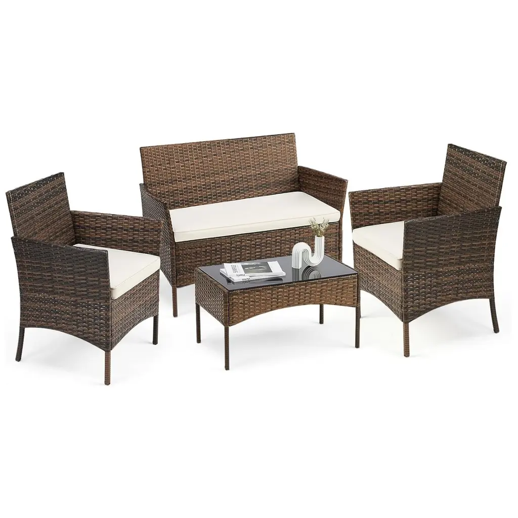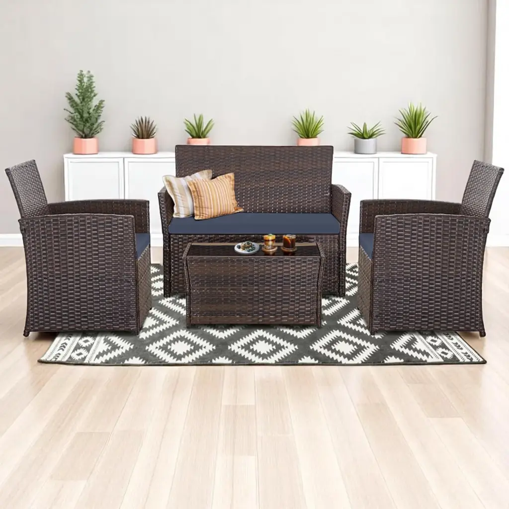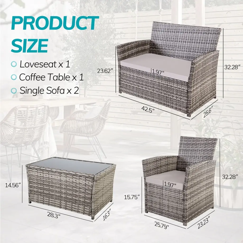 Product Overview This 4-piece Outdoor PE Wicker Furniture Set is the perfect addition to your outdoor space, providing both comfort and style. Featuring a modern gray rattan sectional sofa and removable washable cushions, this set is ideal for gardens, patios, or balconies. The premium PE rattan wicker and rust-resistant steel frame ensure long-lasting durability, while the thickened cushions offer exceptional comfort for outdoor relaxation. With easy assembly and practical features, this set will enhance any outdoor environment for years to come. Product Features Sturdy & Durable Construction: Made with premium PE rattan wicker and a rust-resistant steel frame, this set is designed to withstand all weather variations, offering superior durability. Extra Comfort: The modern sectional sofa is equipped with high-quality, thickened cushions that provide extraordinary comfort, making it perfect for extended periods of relaxation with family and friends. Quick Assembly: Includes all necessary hardware and detailed instructions for easy assembly. The full set arrives in three packages, which may not arrive at the same time. Contact customer service if any damage occurs during transport. Easy to Clean: The cushion covers are zippered and removable for quick and easy machine washing. Hand washing is recommended for better care and to protect the cushion coating. Stylish Design: This outdoor sectional sofa features a contemporary gray rattan design that adds elegance and sophistication to any patio, garden, or balcony. Specifications Color: Gray Rattan with Cushions Frame Material: Rust-resistant steel Fabric: High-density polyester Cushion Thickness: Thickened for extra comfort Assembly Required: Yes Item Weight: 52.9 lbs Carton Size: 30.31" W x 25.20" D x 16.54" H Country of Origin: China Assembly Time: About 1 hour Suitable Scenarios This 4-piece patio set is perfect for small to medium-sized outdoor areas, such as gardens, porches, patios, or balconies. Its modern design makes it an ideal fit for various outdoor environments, offering a comfortable and stylish place to relax, entertain guests, or enjoy quiet moments outdoors. Notes Assembly required. Please follow the included instructions carefully. Colors may vary slightly due to lighting or monitor settings. Please refer to the actual product for color accuracy. To extend the life of the furniture, clean the cushions regularly and store them during harsh weather or use a protective cover.