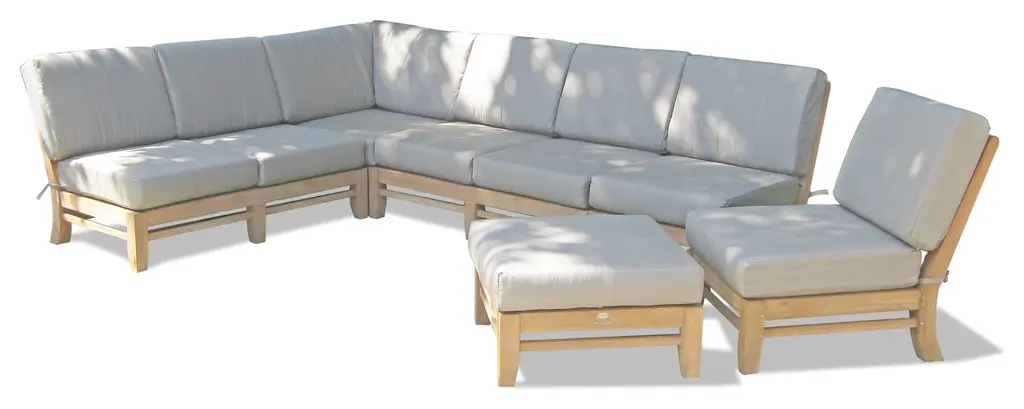 Set includes: 2 Loveseat Sofas, 2 Sofa Chairs, 1 Side/Ottoman Table, 1 Corner Piece AND Sunbrella fabric cushions for 2 Loveseat Sofas, 2 Sofa Chairs, Side/Ottoman, Corner PieceFeatures include:Teak Crafted with broad arms with smooth sanded natural finish and offered with Sunbrella cushions.Constructed with wide planks & clean lines fine sanded Teak in Natural Finish.The Cushions are made out of Sunbrella fabric which is the best for outdoor.All the Cushions comes with a zipper in the back side and ties for easy removal when needed.Standard seat cushions are 5.5" thick and back cushions are 4.5" thick.Piping, extra thick can be done for additional cost, need more fabric choices, Please contact us.Assembly: Very little assembly is required (Hardware & Instructions included). Assembly is quick and simple.Dimensions:Loveseat Sofa Dimensions: 55" Width x 34" Depth x 31" HeightSofa Chair Dimensions: 27.5" Width x 34" Depth x 31" HeightSide/Ottoman Dimensions: 27.5" Square x 10" HeightCorner Piece Dimensions: 34" Square x 31" Height