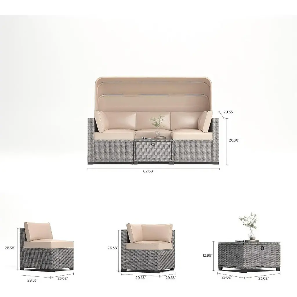 Transform your patio or garden into a luxurious retreat with our versatile 6-piece patio furniture set. Perfectly designed for relaxation and entertaining, this outdoor sectional set combines modern elegance with practical functionality. Crafted from high-quality rattan wicker, it is built to withstand the elements, ensuring long-lasting use and a stylish appearance. This set features adjustable comfort with a canopy and backrest, allowing you to create the perfect lounging experience tailored to your needs. Whether you desire shade or prefer reclining for a leisurely afternoon, this set provides customizable comfort that enhances your outdoor relaxation. The sectional design offers spacious seating, accommodating family and friends with ease, making it ideal for hosting gatherings or enjoying quiet moments. Incorporating both style and functionality, this elegant outdoor sofa set enhances your decor with its sleek, contemporary design. Made from durable, weather-resistant materials, it stands up to various conditions, providing enduring beauty and utility. Perfect for any patio, garden, or outdoor living area, this furniture set elevates your space while offering comfort and sophistication.