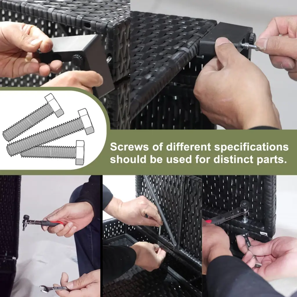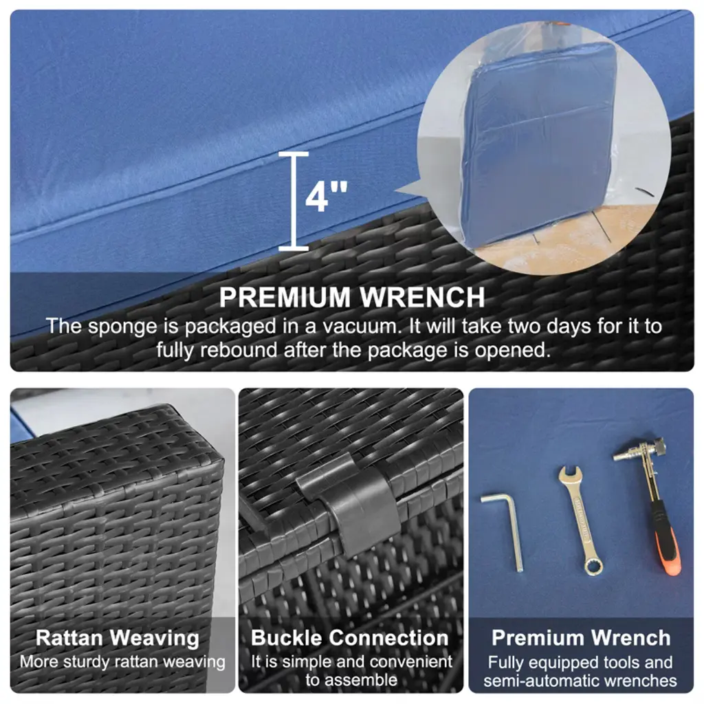 Product Name: 7 Pieces Outdoor Patio Furniture Set Main Material: PE Rattan+Iron+Waterproof Fabric Filler: Fiber Foam and Polyester Fiber Pad Seating Capacity: Seats 6 Easy Assembly: The kit is delivered in three boxes and comes with clear instructions and spare screws, and the addition of a semi-automatic wrench will greatly reduce assembly time. Low-Maintenance: The tempered glass coffee table top and removable,The tempered glass top allows you to place your drinks, meals on it. while the water-resistant cushions ensure longevity when covered or stored indoors during adverse weather. Tip: Since the seat cushion is vacuum packed, it takes 48 hours for the sponge to fully rebound after unpacking.
