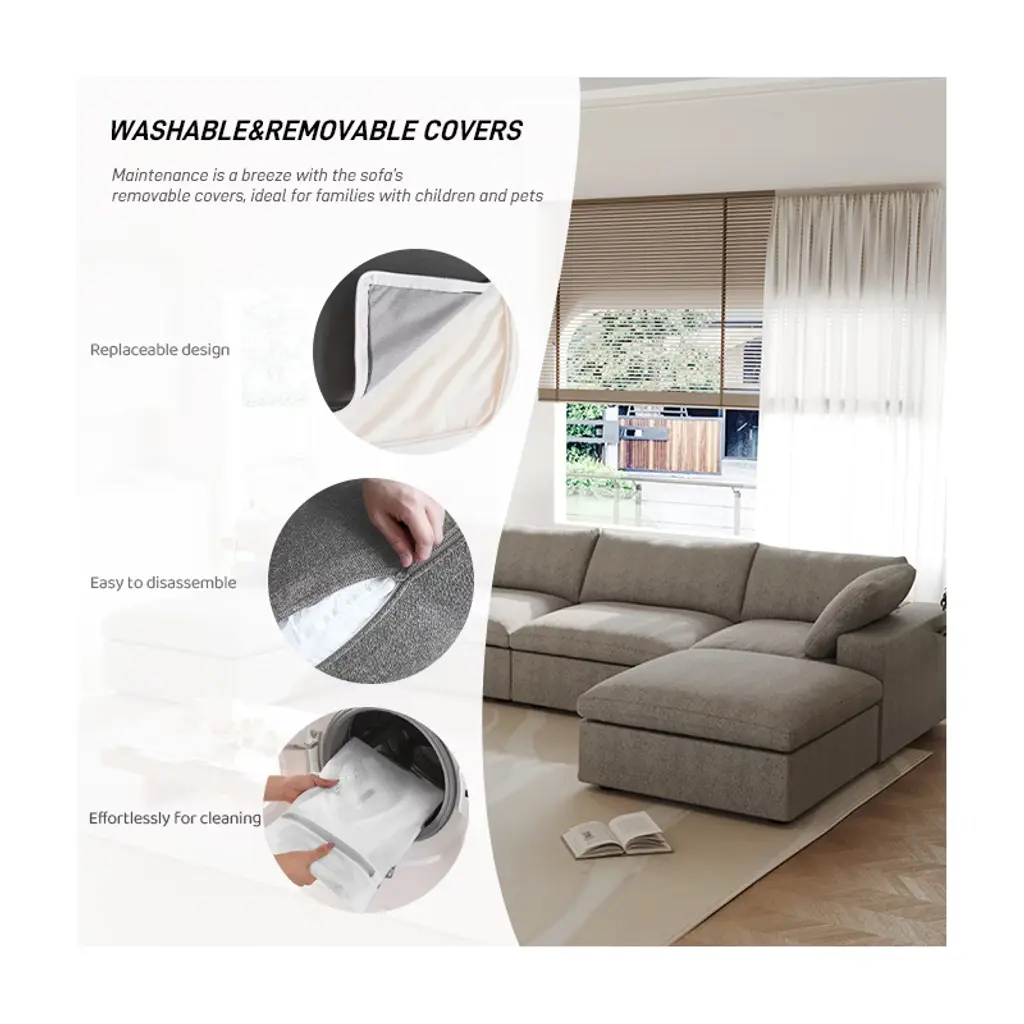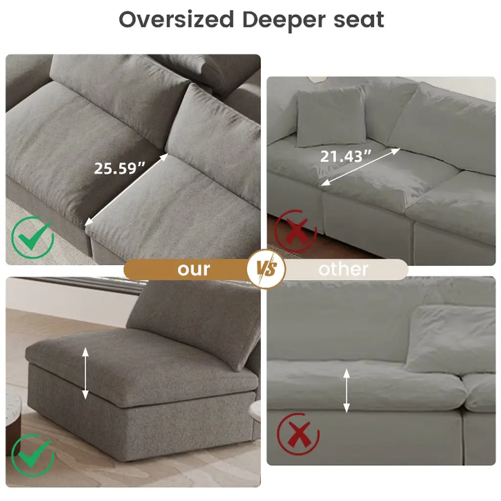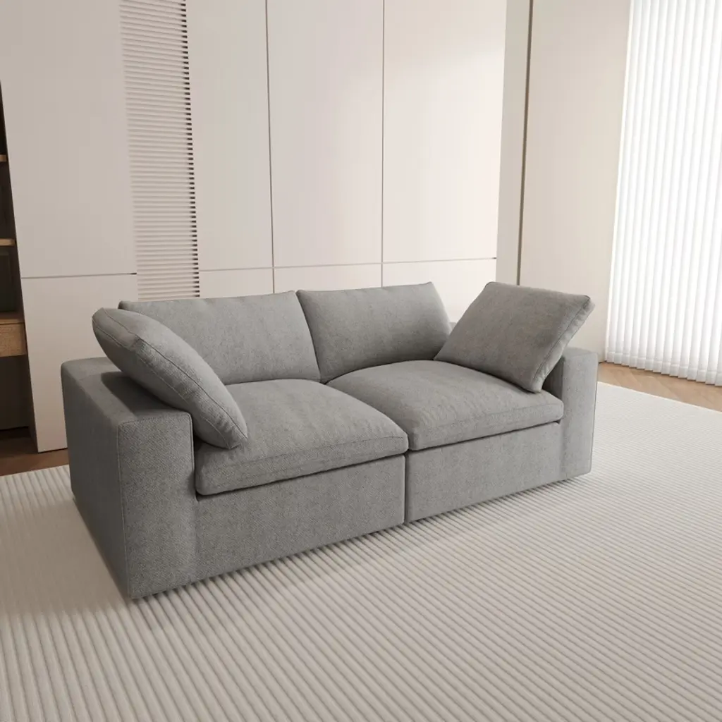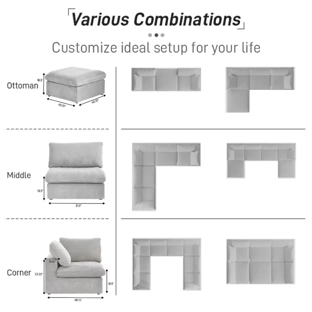 The Skycloud sofa is designed to provide "cloud-like comfort." Its filling combines sponge, cotton, and down in the perfect ratio, making it soft yet resilient, which ensures comfort without sagging. The Skycloud sofa also has a modular design: you can freely combine the seats, arrange or remove the arm cushions, and choose from three modules: corner, armless, and ottoman. These features offer endless possibilities for arrangement. The Skycloud sofa is designed to provide "cloud-like comfort." Its filling combines sponge, cotton, and down in the perfect ratio. Thanks to this filling, the Skycloud sofa is soft yet resilient. In addition, the Skycloud sofa is highly modular: you can freely combine the seats, and arrange or remove the arm cushions. Besides, you can choose from three modules: corner, armless, and ottoman. These features offer endless possibilities for arrangement. BY other word: Elevate your living space with this expansive this cloud sofa, designed for ultimate comfort and versatility. The sofa features a sturdy solid wood frame, ensuring durability and long-lasting support. Upholstered in premium hemp-blend fabric, it offers a dense yet soft texture, combining wear resistance, moisture resistance, and a static-free experience. The feather-filled cushions provide a plush, cloud-like seating experience, while the modular design allows you to customize the layout to suit your space. The included convertible ottoman adds extra functionality, perfect for lounging or additional seating. For added convenience, the removable and washable covers make maintenance a breeze. With its generous seating width and depth, this sofa offers ample space to stretch out and relax, making it the perfect centerpiece for your home. Upgrade your comfort with this stylish and practical sectional sofa today!