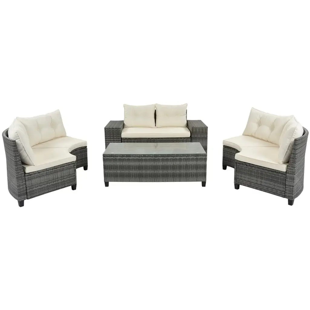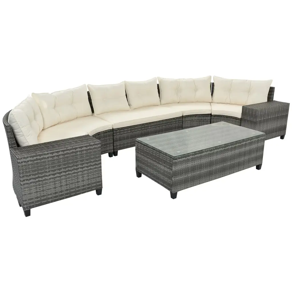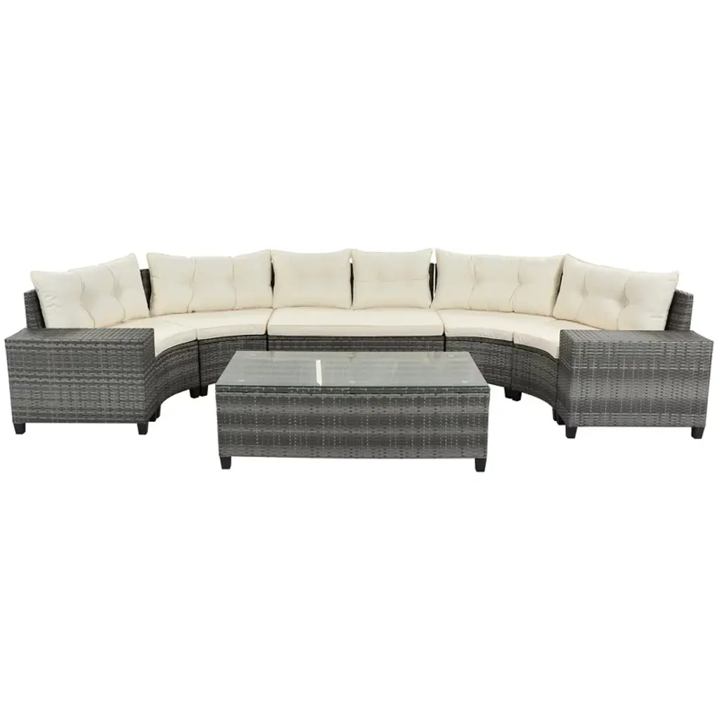 8-Piece Outdoor Sofa Set ¨C Stylish and Comfortable for Your Outdoor Oasis Transform your patio or garden into a cozy and inviting space with this 8-Piece Outdoor Sofa Set. Designed with a modern half-moon shape, this unique set combines style and comfort to create a perfect lounge for relaxation or gatherings. Whether you're hosting a party or simply unwinding, this set offers versatile seating arrangements to suit your needs. Product Features Curved Design: The 8-piece sofa set features a modern half-moon shape, creating a distinctive semicircular lounge. This unique design adds a touch of elegance to your outdoor space while providing ample seating for everyone.Excellent Quality: Crafted with weather-resistant PE rattan wicker and a sturdy steel frame, this set ensures durability in outdoor conditions. The cushions are filled with thick foam and covered with waterproof, UV-resistant polyester fabric, providing long-lasting comfort.Flexible Combination: The modular design allows you to customize the layout of the pieces to suit your space and preferences. Rearrange the set to fit different seating configurations based on your outdoor area, ensuring maximum flexibility.Comfortable & Multifunctional: The set includes thick back-support cushions for optimal comfort. It also comes with side and coffee tables featuring tempered glass tops, ideal for placing drinks, snacks, or decor. The glass is securely attached with suction cups for added safety.Detailed Tutorial: The set comes with a clear installation guide that can be easily completed by 1-2 adults in about an hour. All tools for assembly are included, and the set is securely packed in four flat packages, which may arrive separately. Product Description This 8-Piece Outdoor Sofa Set is designed for comfort and versatility. Constructed from high-quality, weather-resistant PE rattan wicker and a durable steel frame, this set is built to withstand the elements while providing stylish seating for your outdoor space. With thick, foam-filled cushions and modular components, you can easily rearrange the pieces to suit your patio, garden, or balcony. The included side and coffee tables offer additional convenience, with securely attached tempered glass for safety and stability. Component 4 Scalloped Sofas1 Double Seat1 Coffee Table2 Side Tables Weight Capacity: Wicker Sofa: 250 lbs per seatCoffee Table: 125 lbs Assembly Adult Assembly Required: YesAdditional Tools Required: All tools included Enhance your outdoor living with this elegant and comfortable 8-piece sofa set ¨C the perfect addition to any patio, garden, or poolside retreat.