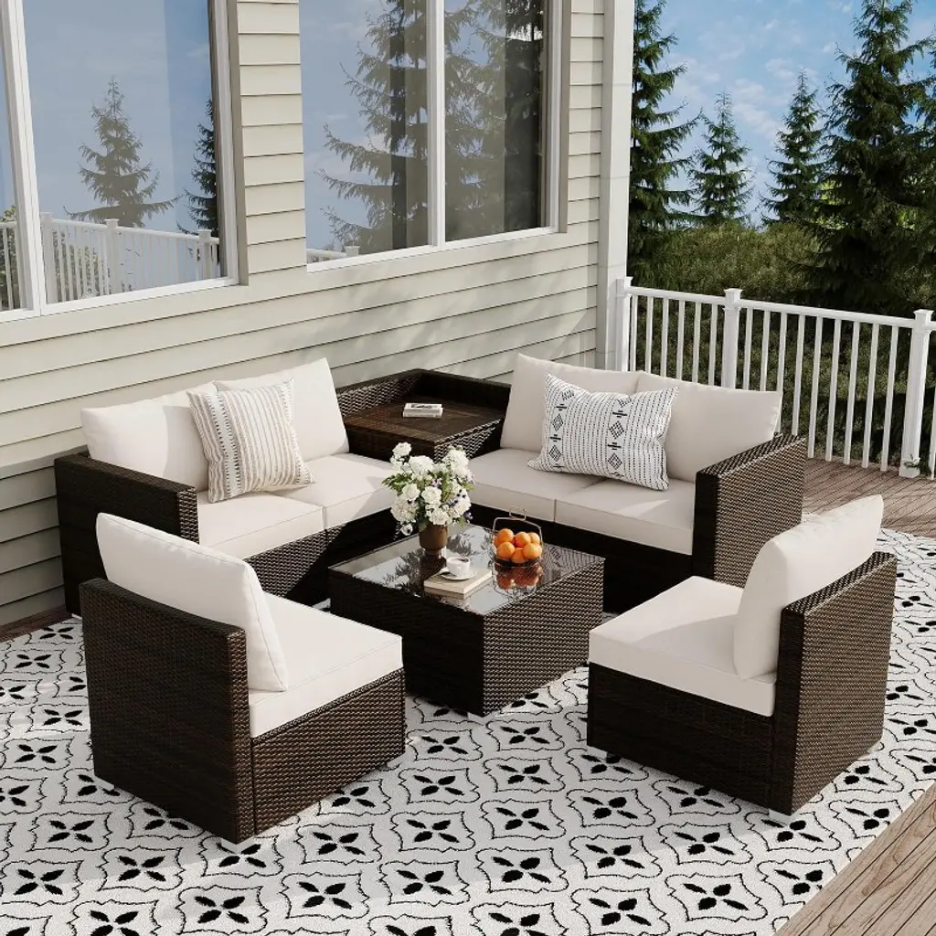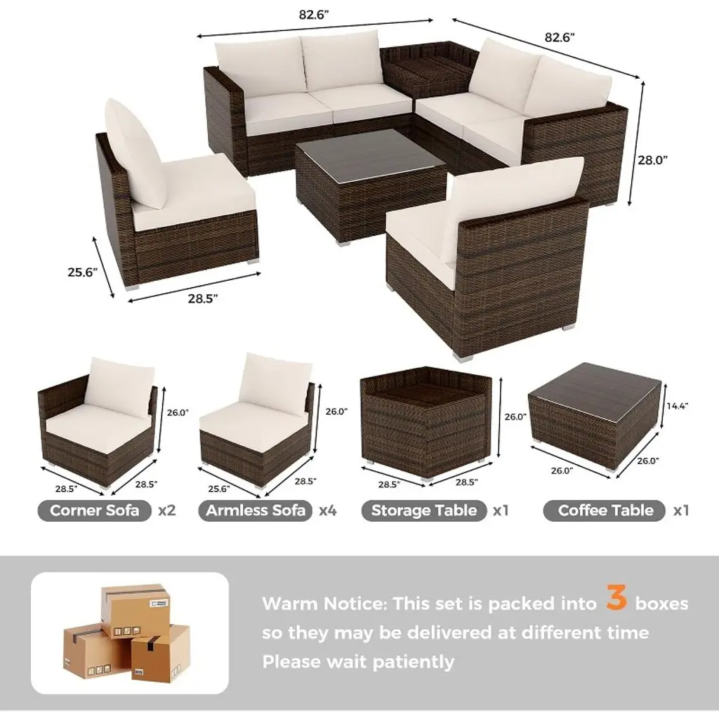Upgrade your outdoor living space with this 8-piece modular patio conversation set, designed for comfort, style, and functionality. The set features six spacious sectional sofas with plush, water-resistant cushions, a sleek tempered glass coffee table, and a hidden storage box for ultimate convenience. Handwoven PE rattan and a sturdy metal frame provide durability and weather resistance, while the modular design allows you to customize the layout to fit any outdoor occasion. Perfect for the backyard, porch, poolside, or garden, this set brings inviting style and practical storage to your favorite outdoor gatherings. All cushions feature machine-washable covers for simple maintenance. Assembly is easy with included instructions.?Warm Notice: ThiS set iS packed into 3 boxes, so they may be delivered at different time. Please wait patiently.