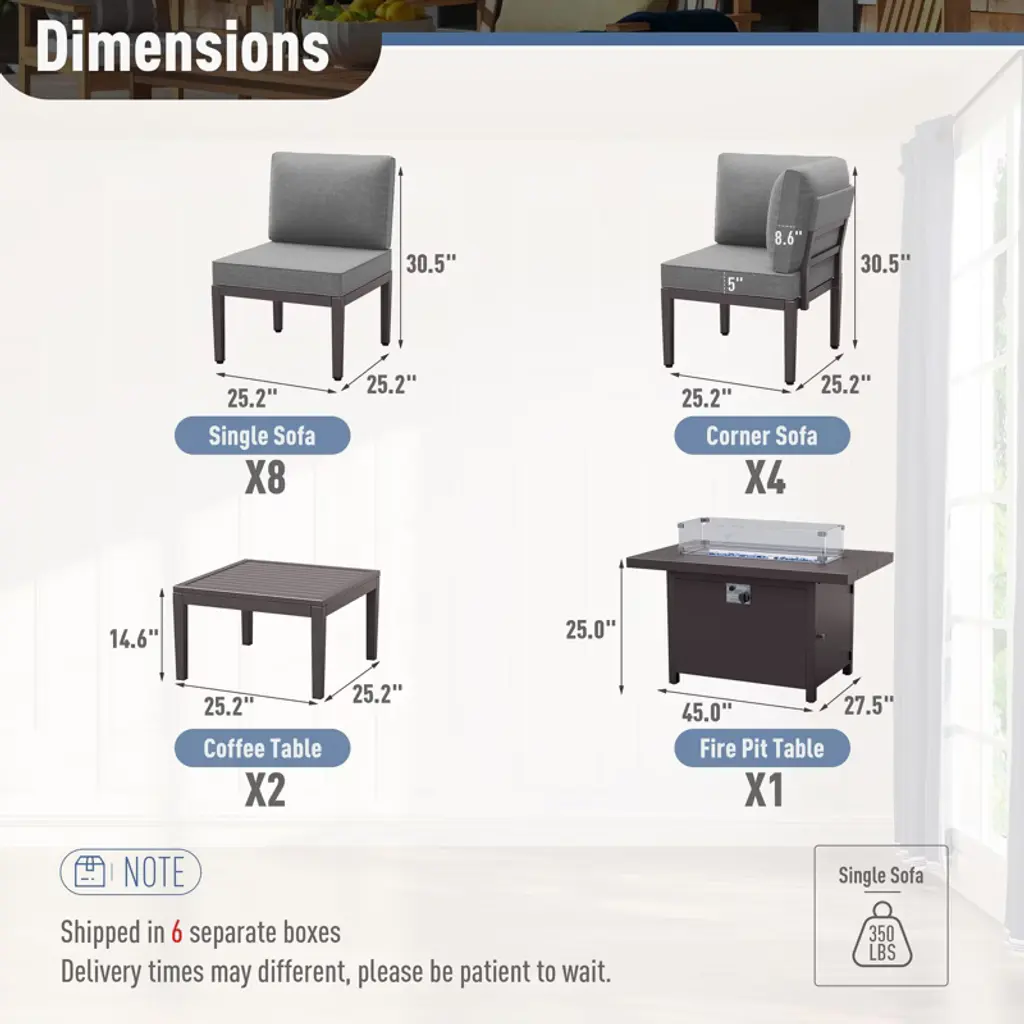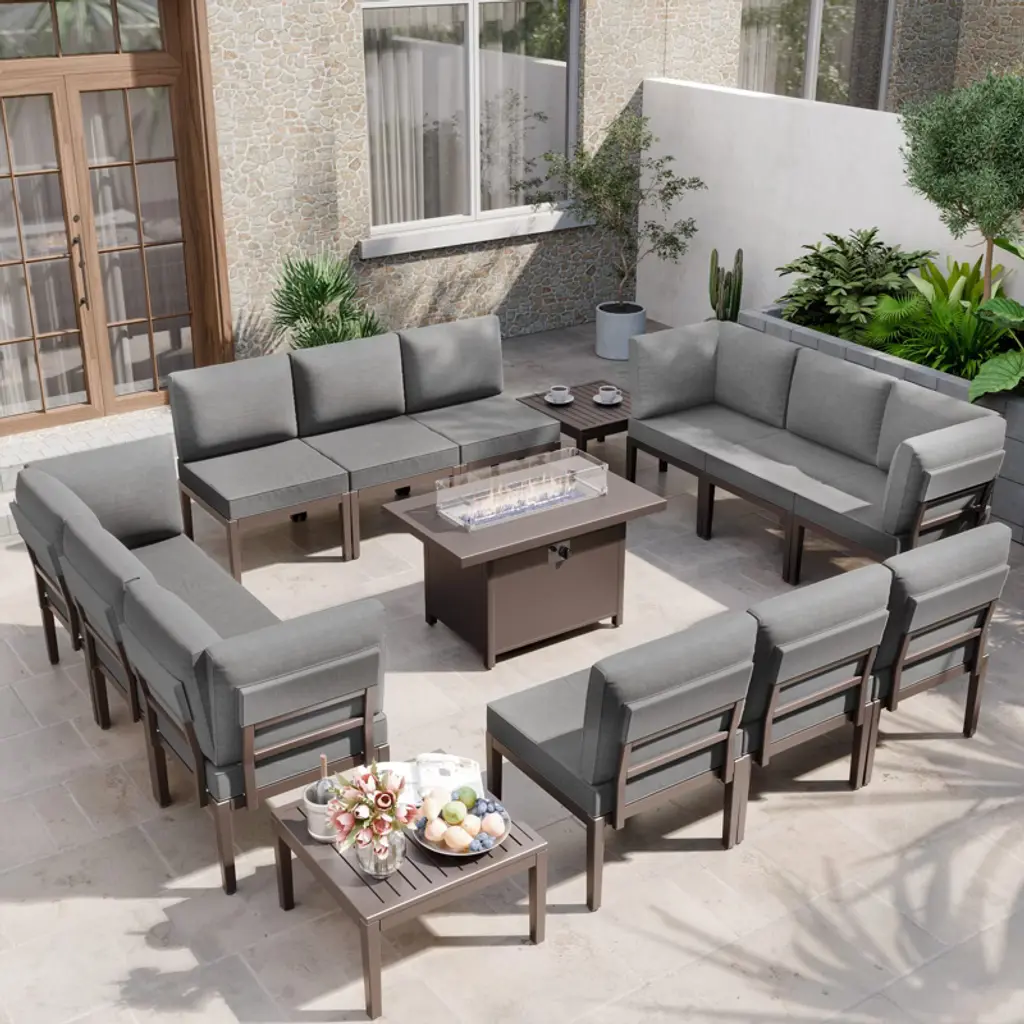 Alaulm 15 Pieces Metal Patio Furniture Set Modern Metal Outdoor Conversation Sets W/45in Propane Fire Pit Table, Patio Sectional Sofa, Grey