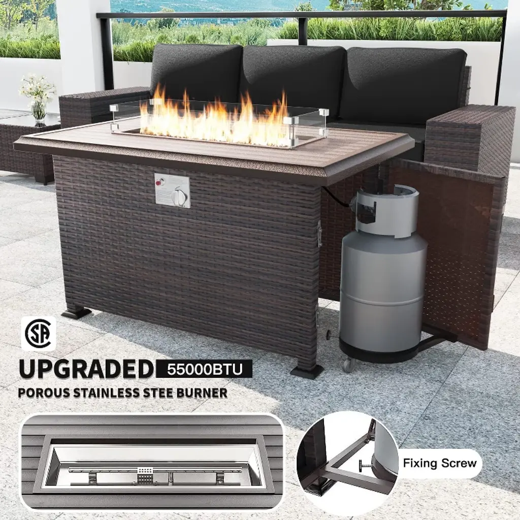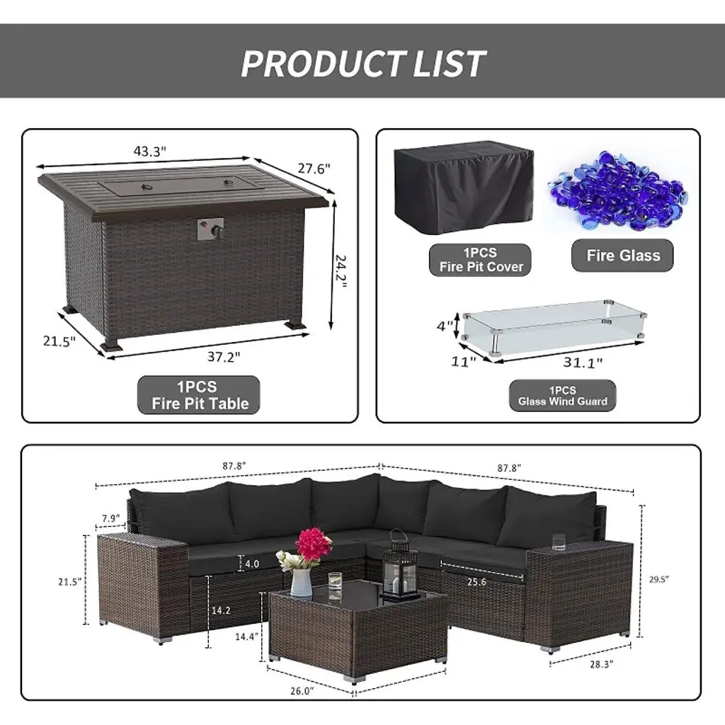 Alaulm 7 Pieces Outdoor Patio Furniture Set With 43" Gas Propane Fire Pit Table Pe Wicker Rattan Sectional Sofa Patio Conversation Sets,black