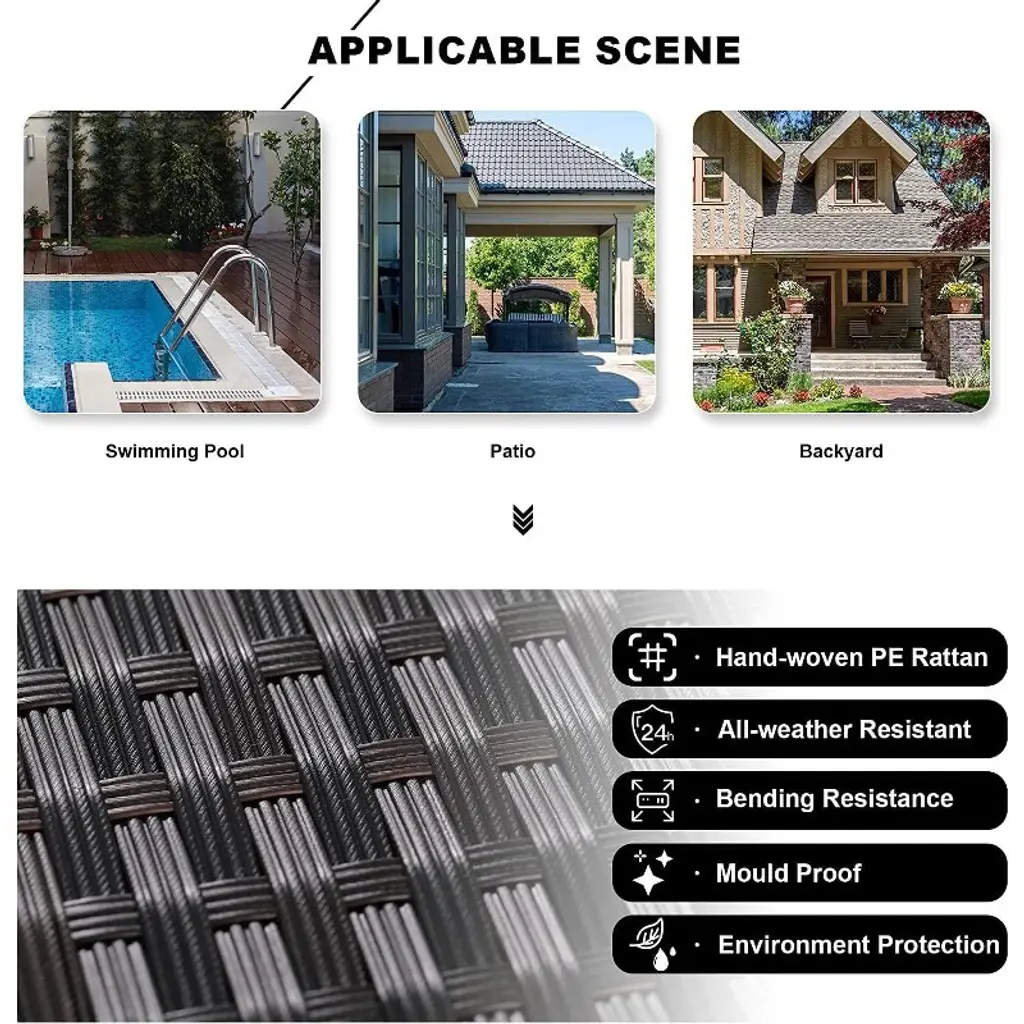 This high-quality ALAULM outdoor woven rattan sofa set brings joy to your outdoor living! Hand-woven PE rattan is waterproof and fade-resistant, while the powder-coated steel frame ensures stability and balance. High-density fabric makes the cushions and pillows fade-resistant and waterproof, and the thickened 4-inch memory foam core effectively relieves body pressure! Modular patio sofa—your one-of-a-kind choice! Please Note: The product will be shipped in 5 separate packages, and delivery times may vary.