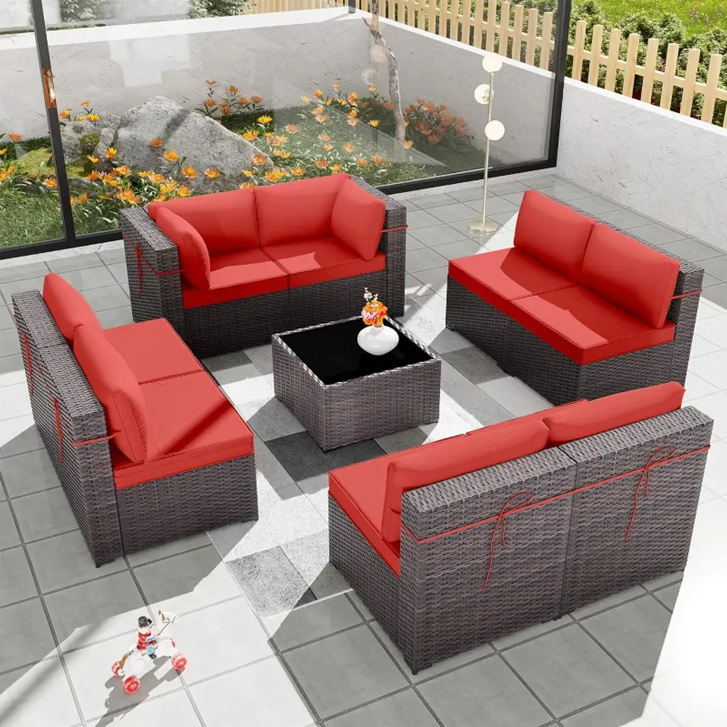 Alaulm 9 Pieces Patio Furniture Set, Rattan Wicker Outdoor Conversation Sets, Furniture Sectional Sofa Set W/4" Cushion And Glass Coffee Table(red)