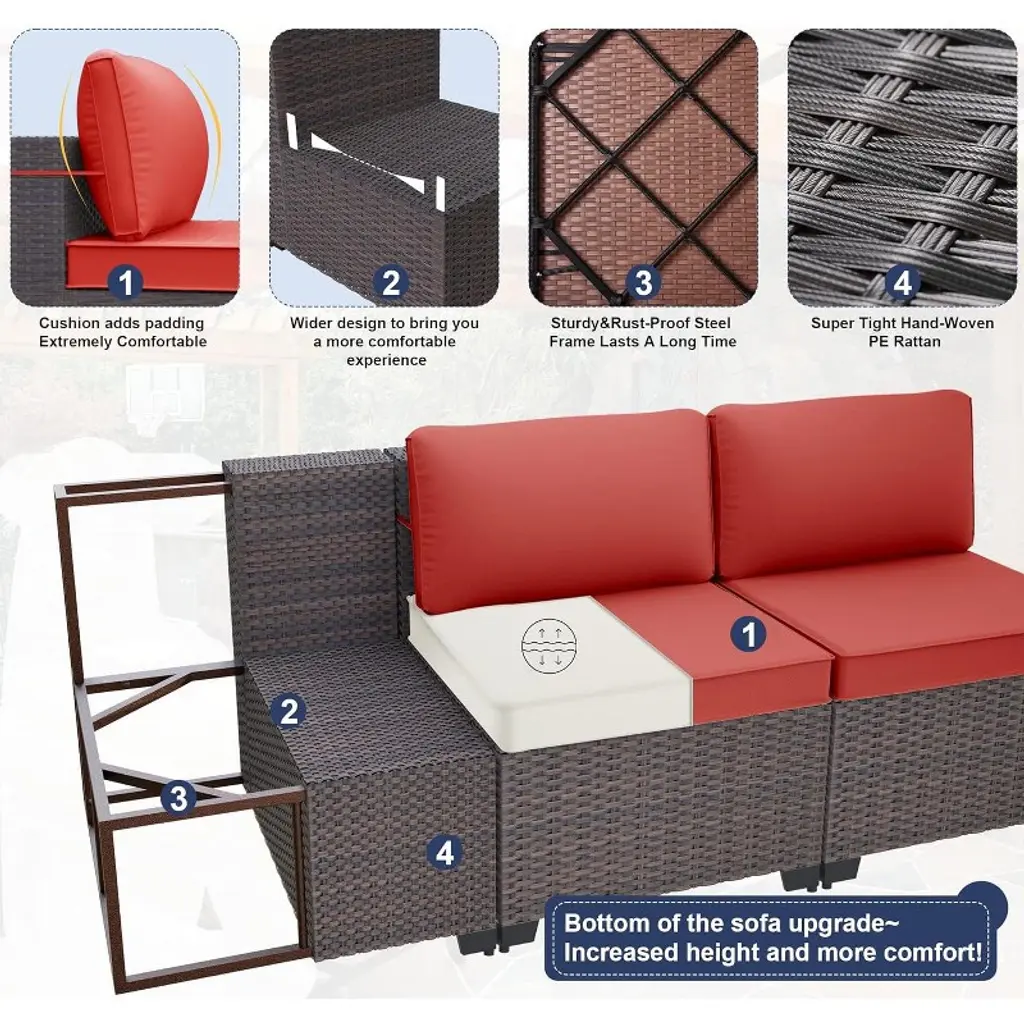 This high-quality ALAULM outdoor woven rattan sofa set brings joy to your outdoor living! Hand-woven PE rattan is waterproof and fade-resistant, while the powder-coated steel frame ensures stability and balance. High-density fabric makes the cushions and pillows fade-resistant and waterproof, and the thickened 4-inch memory foam core effectively relieves body pressure! Modular patio sofa—your one-of-a-kind choice! Please Note: The product will be shipped in 4 separate packages, and delivery times may vary.