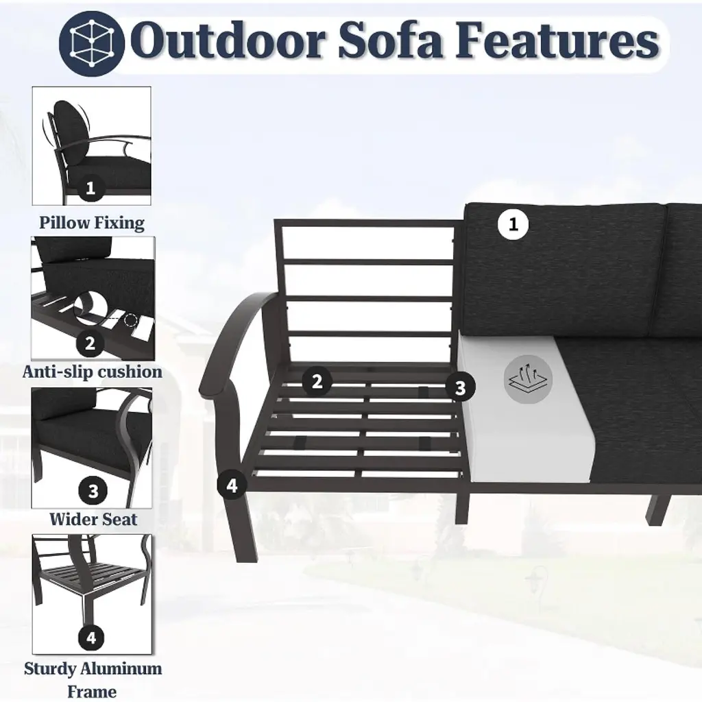 Upgraded Aluminum Frame: ALAULM modern patio furniture set is crafted with upgraded premium all aluminum, which is both strong and durable, making a difference in iron sofas on the market. Constructed from powder-coated aluminum frames, that's water-resistant, UV-resistant, and rust-resistant under various weather conditions. High quality and practical patio furniture set.