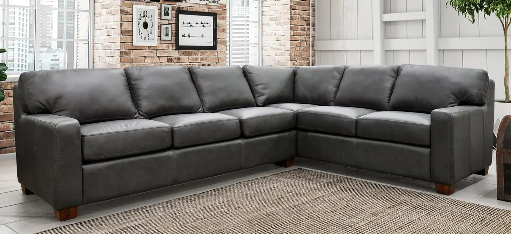 The Albany Sectional 2-pc. is proudly made in the USA from 100% top grain leather and is built to last with its Limited Lifetime Frame & Spring warranty. It begins with sleek, transitional track arm styling which is a perfect compliment to any d_cor. It's then upholstered in a soft and subtly two-toned Aniline Plus top grain leather which retains the natural beauty and feel of the leather hide while providing superior protection against everyday use. Double stitched seams offer the utmost in strength & durability, while fully padded side & back panels add structure and quality.
