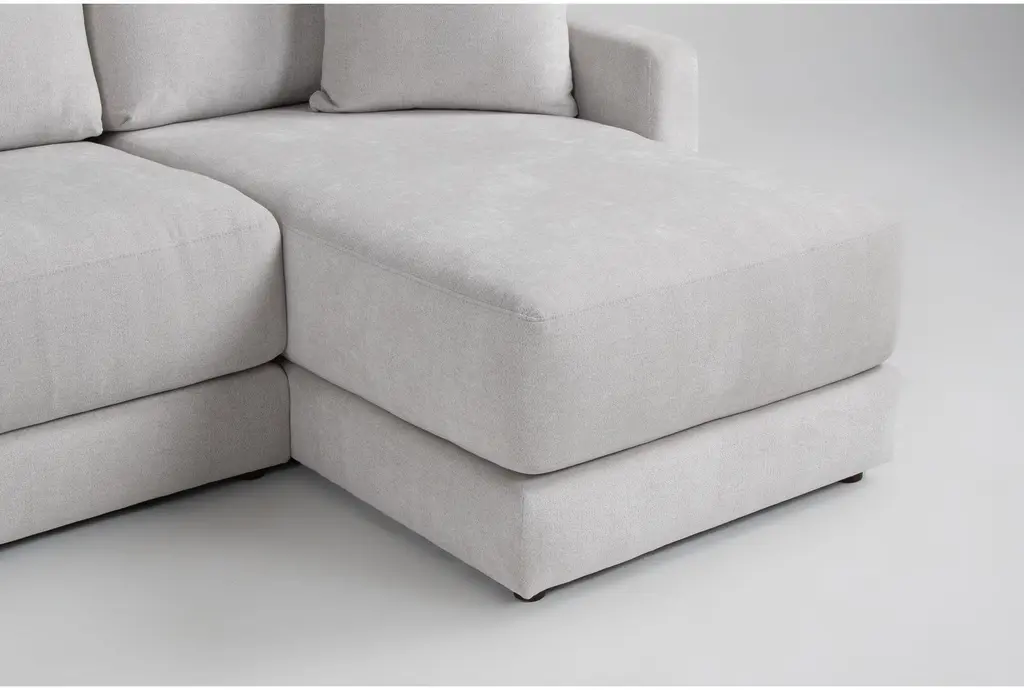 Introducing the Alicia Greige Chenille 140" 4 Piece Sectional With Right Arm Facing Chaise & Ottoman, designed to bring comfort and style to your living room. This casual sectional is upholstered in soft greige chenille fabric, offering a neutral palette that complements any decor. Perfect for family gatherings or relaxing evenings, this sectional provides ample seating and plush cushions for ultimate comfort.