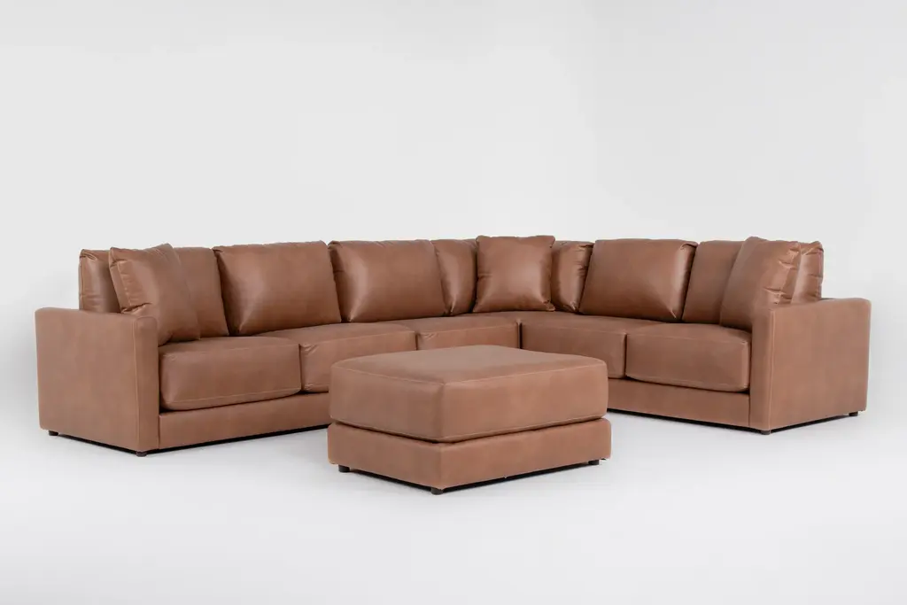 Transform your living space with the Alicia Saddle Brown Vegan Faux Leather 140" 4 Piece Sectional & Ottoman. This casual sectional offers a comfortable and spacious seating solution, perfect for family gatherings or lounging. The rich saddle brown color adds a warm and inviting touch to any room.