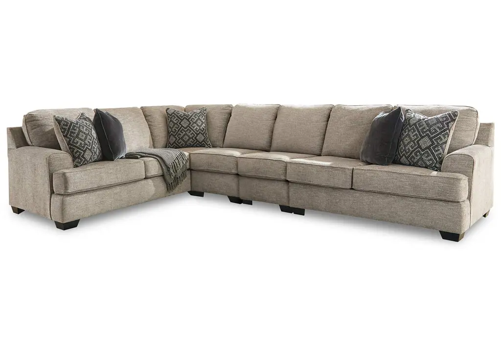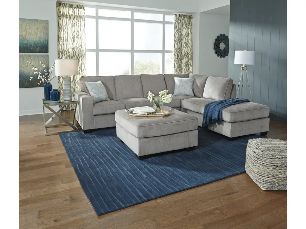 If style is the question, then the Altari 2-piece sectional with ottoman is the answer. Sporting clean lines and sleek track arms, the decidedly contemporary profile is enhanced with plump cushioning and a chenille-feel upholstery that's so pleasing to the touch. Sure to play well with so many color schemes, this living room set in richly neutral alloy includes understated floral pattern pillows for fashionably fresh appeal.