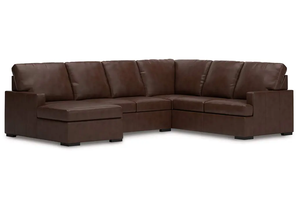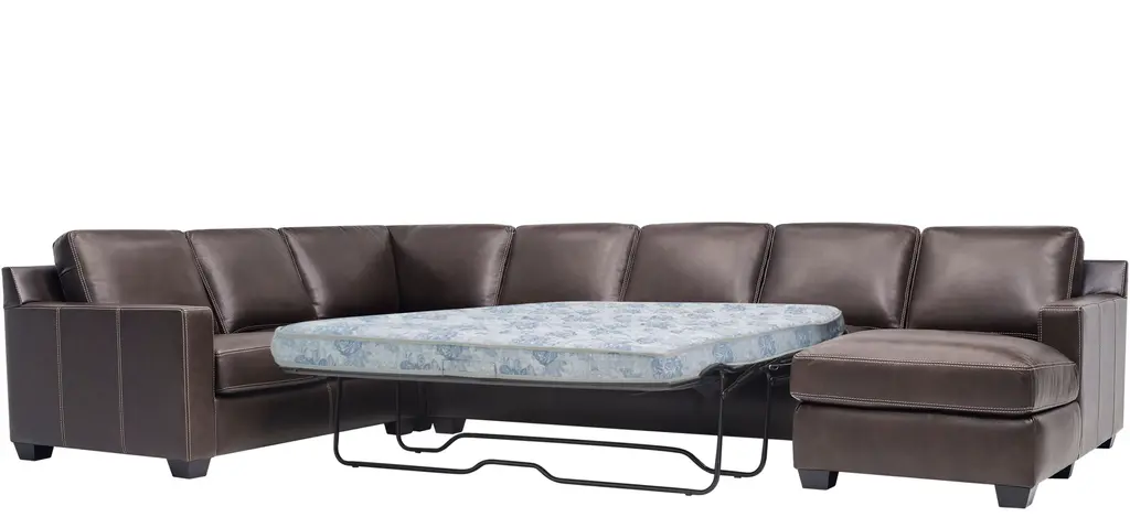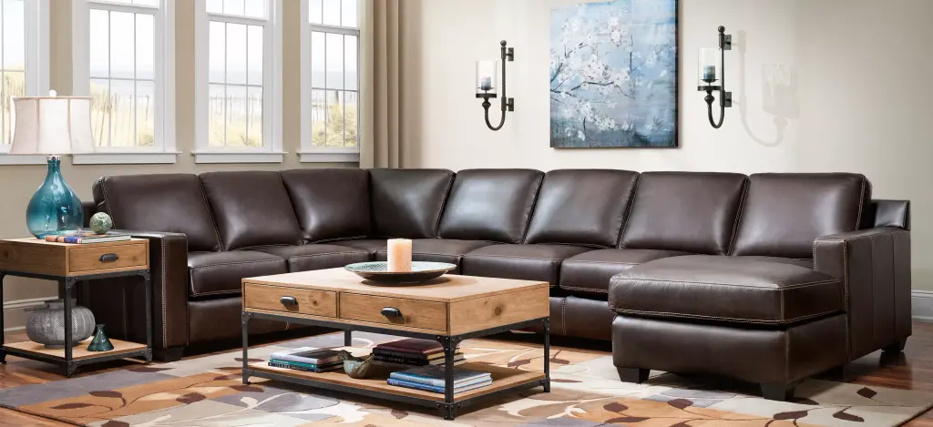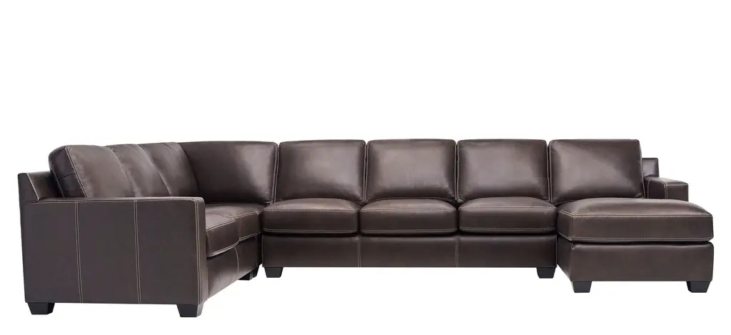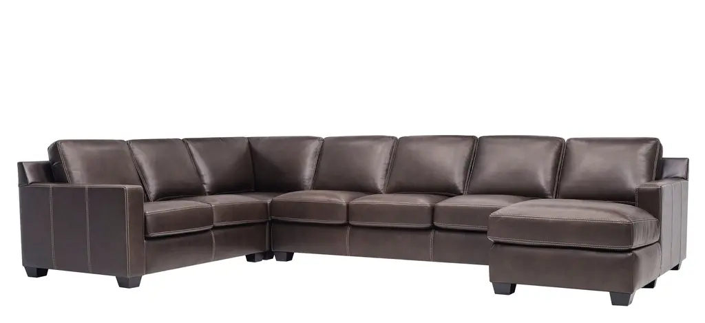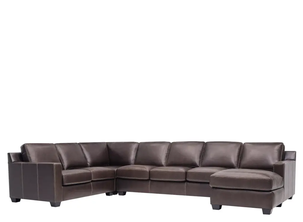 For a clean, contemporary living room with plenty of comfort, look to the Anaheim 4-piece leather sectional. This piece features stylish top-grain leather seating that's smooth to the touch, trendy track arms and plush stuffed back cushions for ultimate comfort.