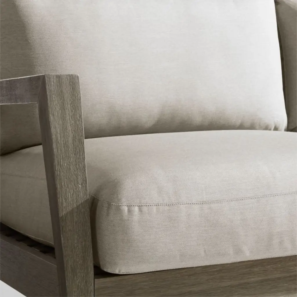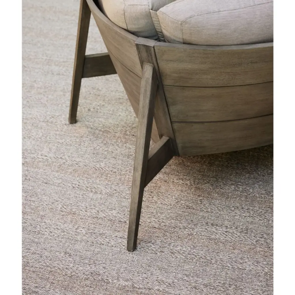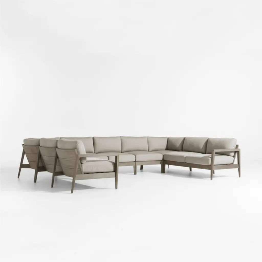 Our Andorra outdoor seven-piece sectional owes its coastal cool vibe to fine workmanship and contemporary lines. Combining two corners and three armless chairs with left- and right-arm sofas, the U-shaped sectional features mahogany frames and wide-slatted backrests made of bentwood eucalyptus. Flaring arms, angled back legs and pointed corners that resemble the bow of a ship make this a sofa that looks good at any angle. Wire-brushing and a grey-brown finish replicate the look of sea-weathered wood, while weather-resistant taupe seat and back cushions add an extra layer of stay-awhile comfort.Additional Sunbrella® cushion colors available.