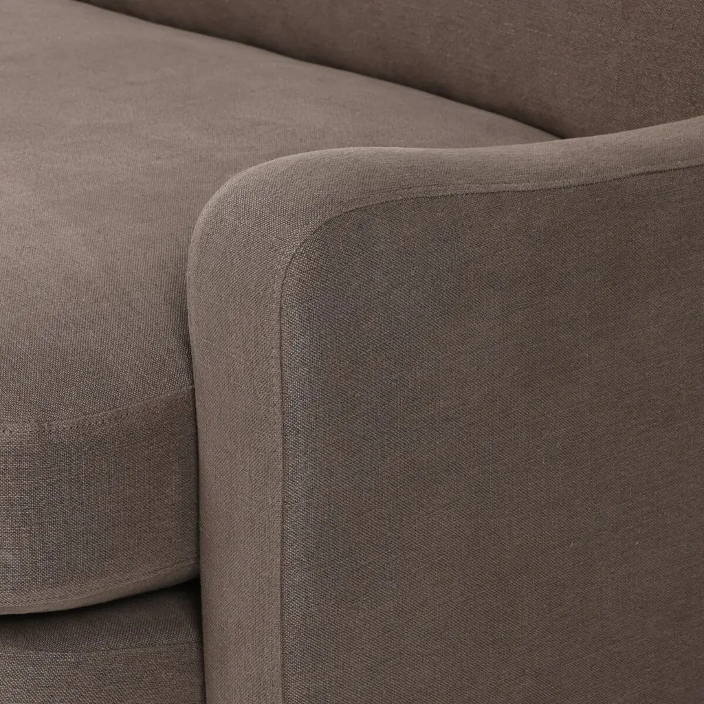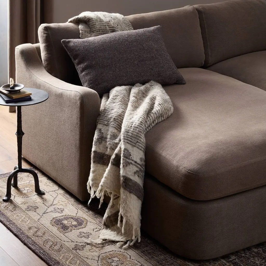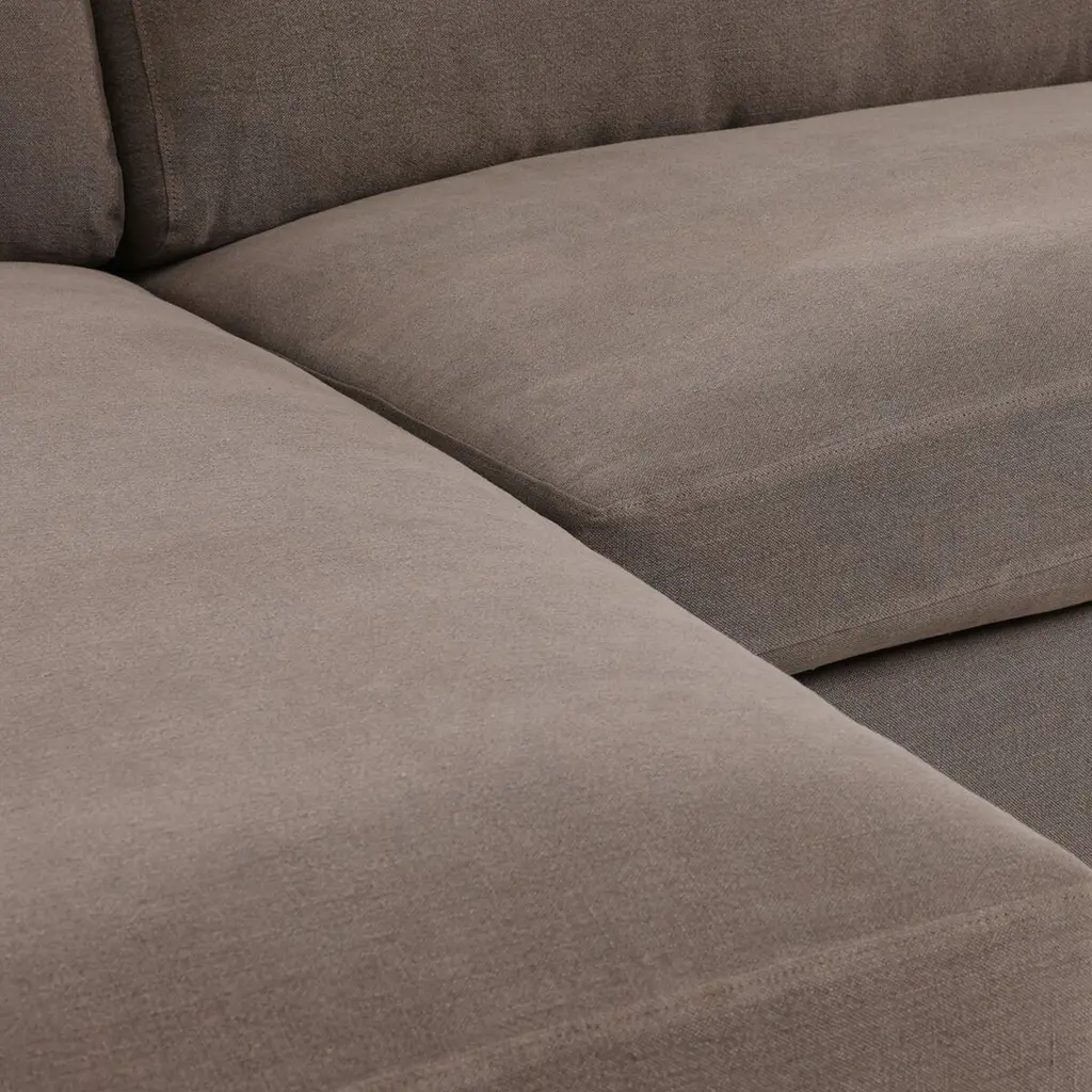 Heritage-inspired comfort. The sectional's sloping track arms and elongated front decking are a study in playful forms, while subtle boxing along the front perimeter maintains a simple, polished look. The boxed cushions incorporate a feather/fiber blend and S-spring suspension for the ultimate sink-in sit. Covered in 100% linen. A design collaboration by Amber Lewis and Four Hands.