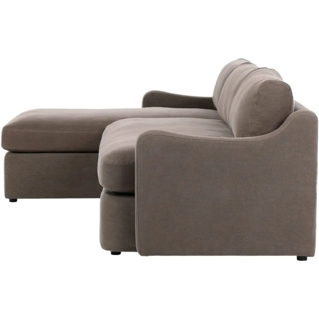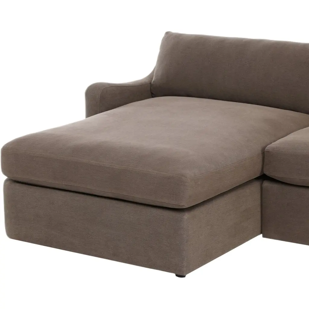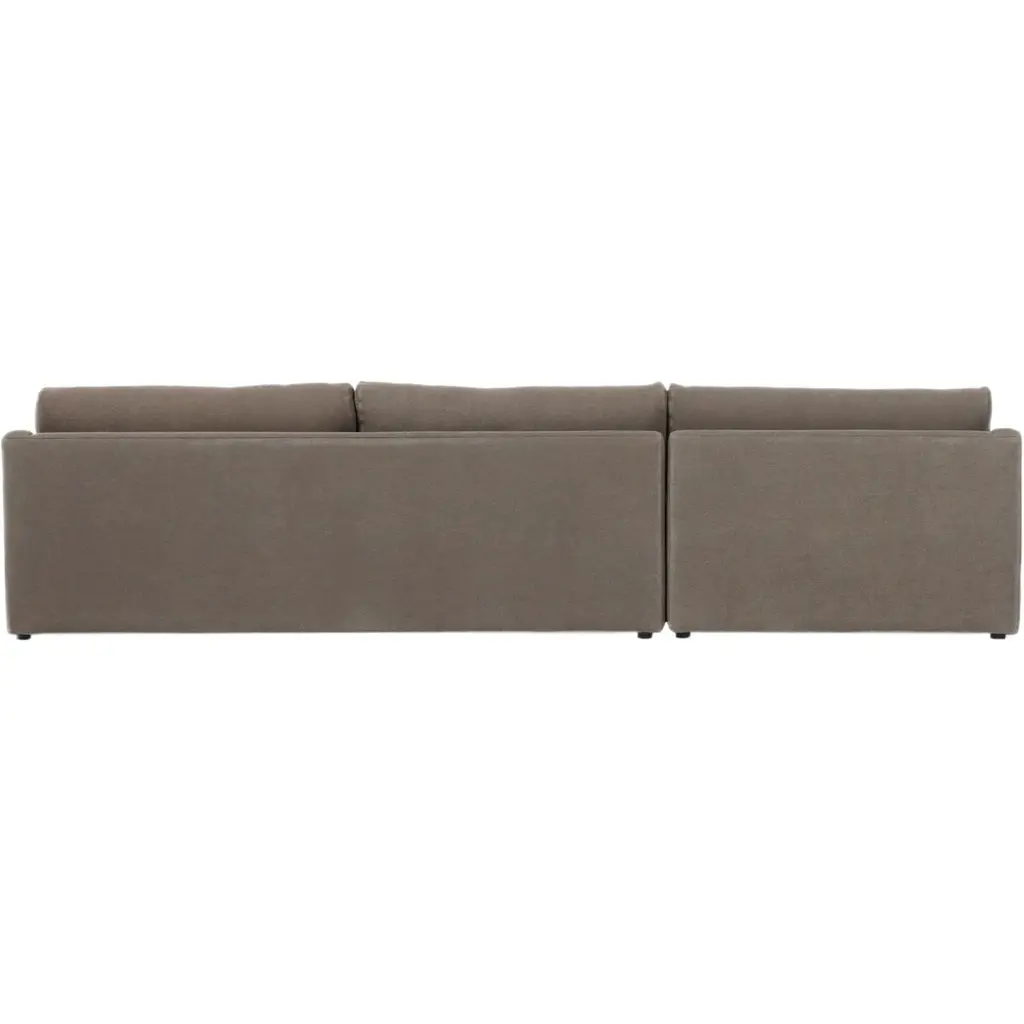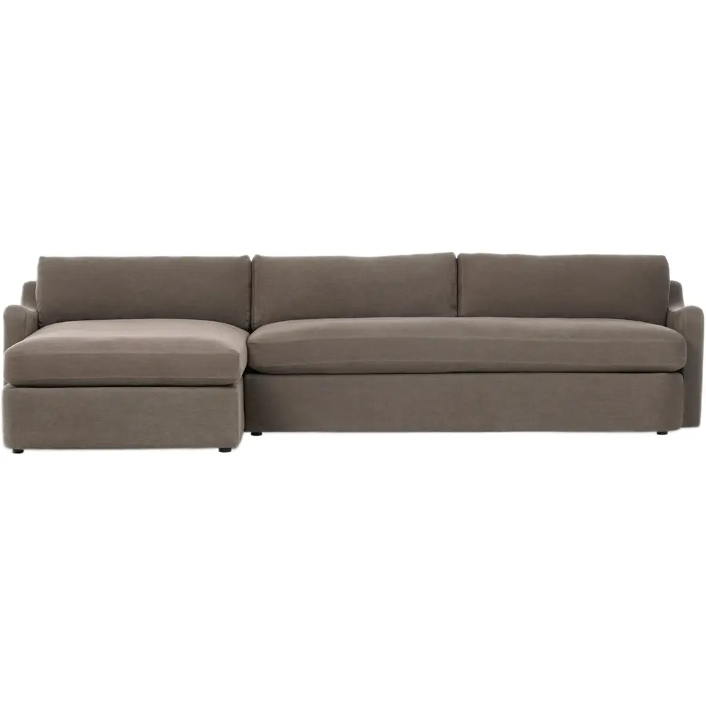 Heritage-inspired comfort. The sectional's sloping track arms and elongated front decking are a study in playful forms, while subtle boxing along the front perimeter maintains a simple, polished look. The boxed cushions incorporate a feather/fiber blend and S-spring suspension for the ultimate sink-in sit. Covered in 100% linen. A design collaboration by Amber Lewis and Four Hands.