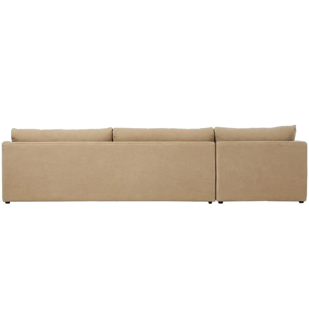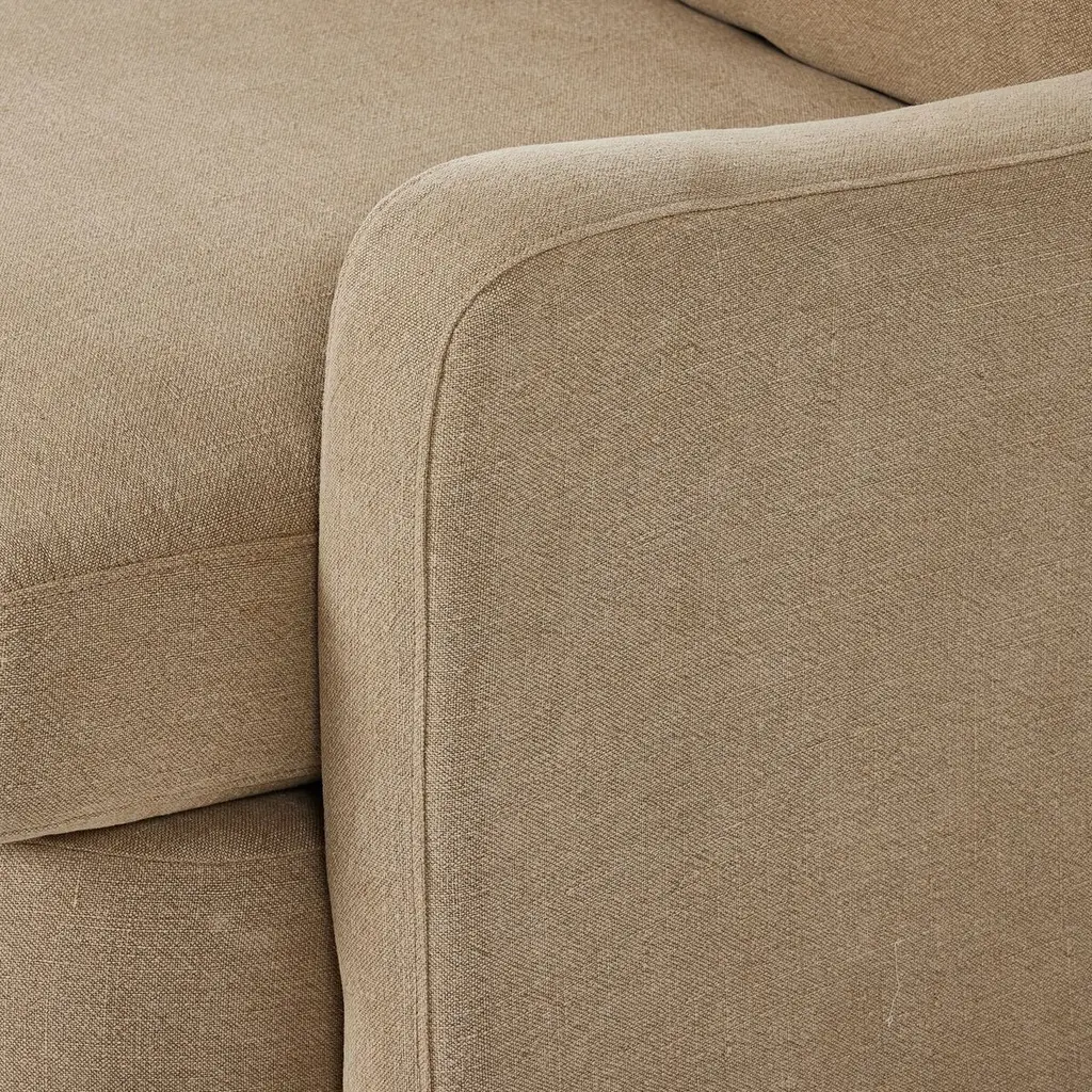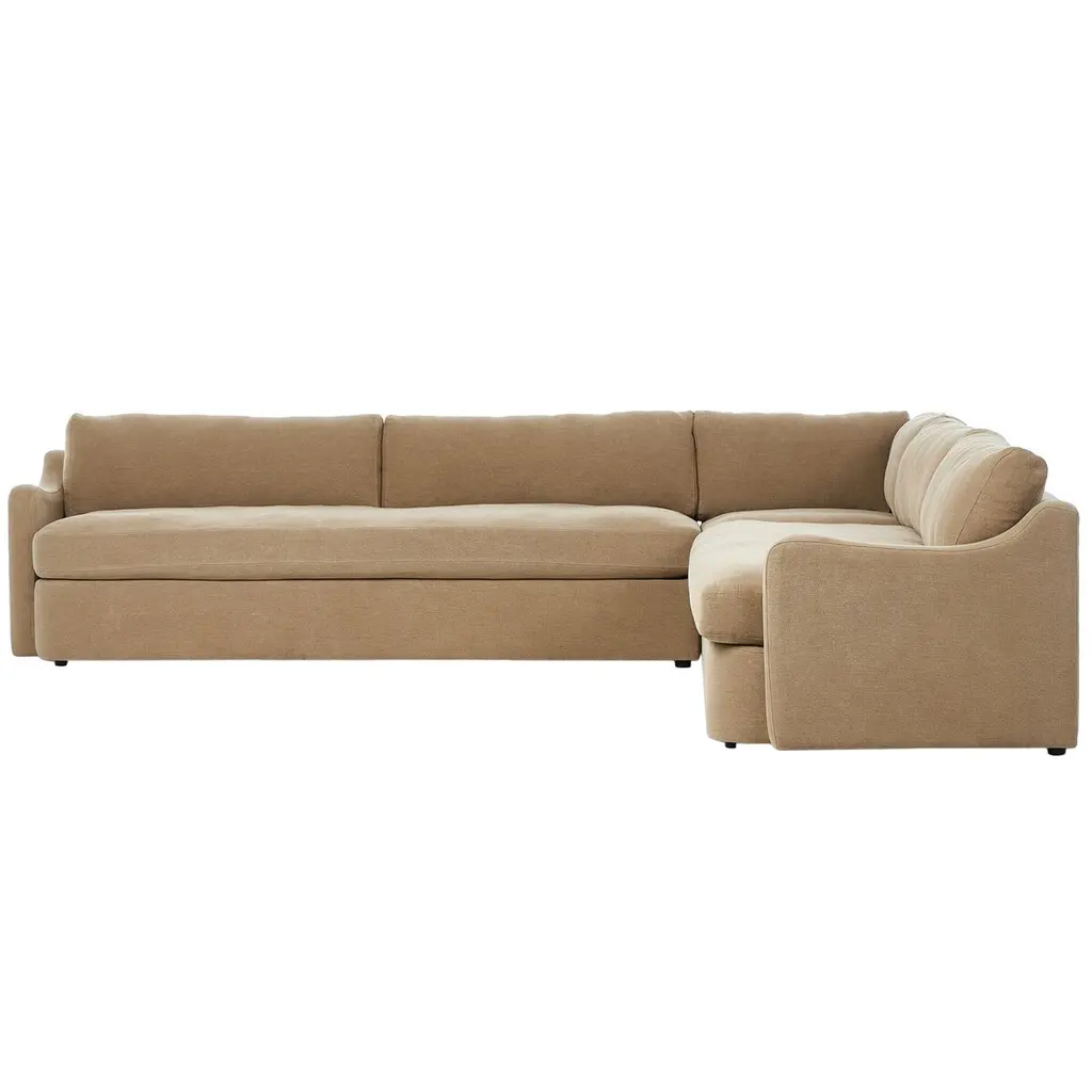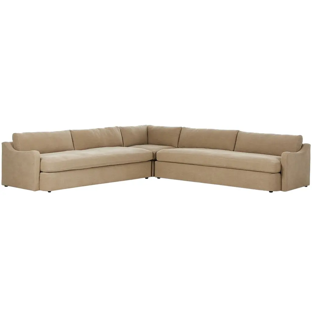 Heritage-inspired comfort. The three-piece sectional's sloping track arms and elongated front decking are a study in playful forms, while subtle boxing along the front perimeter maintains a simple, polished look. The boxed cushions incorporate a feather/fiber blend and S-spring suspension for the ultimate sink-in sit. A design collaboration by Amber Lewis and Four Hands.