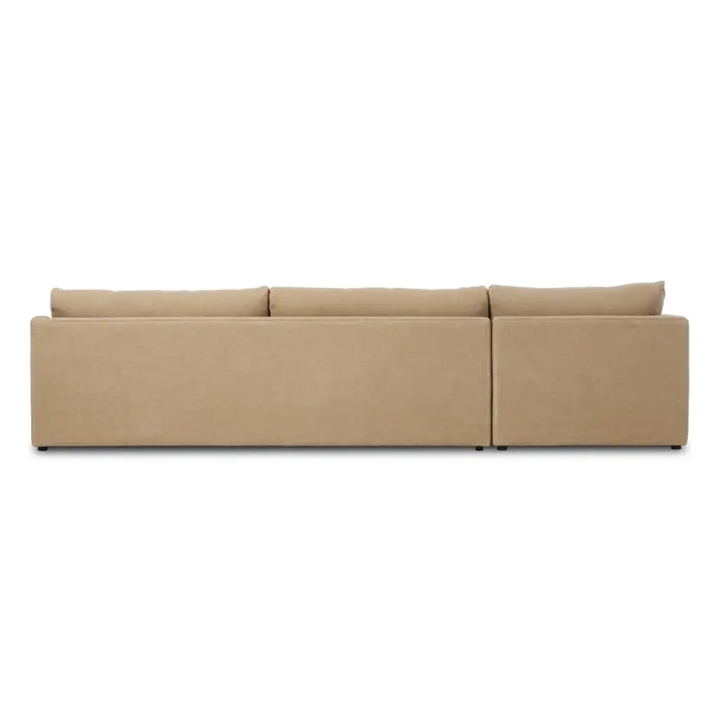 Heritage-inspired comfort. The three-piece sectional's sloping track arms and protruding front decking are a study in playful forms, while subtle boxing along the front perimeter maintains a simple, polished look. The boxed cushions incorporate a feather/fiber blend and S-spring suspension for the ultimate sink-in sit. Covered in 100% linen. A design collaboration by Amber Lewis and Four Hands.