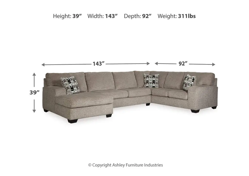 A mastery in less is more, the Ballinasloe sectional manages to make cool, contemporary design so warm and cozy. A new twist on neutral, the sectional’s soothing "platinum" tone upholstery is incredibly plush to the touch. Gently rounded corners give the clean-lined profile a sense of ease, for a high-style look that’s ultra inviting. Weight 323.000 lbs. (145.35kgs.)