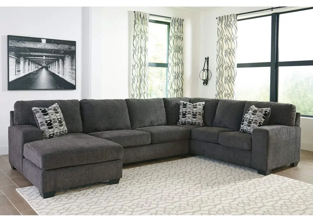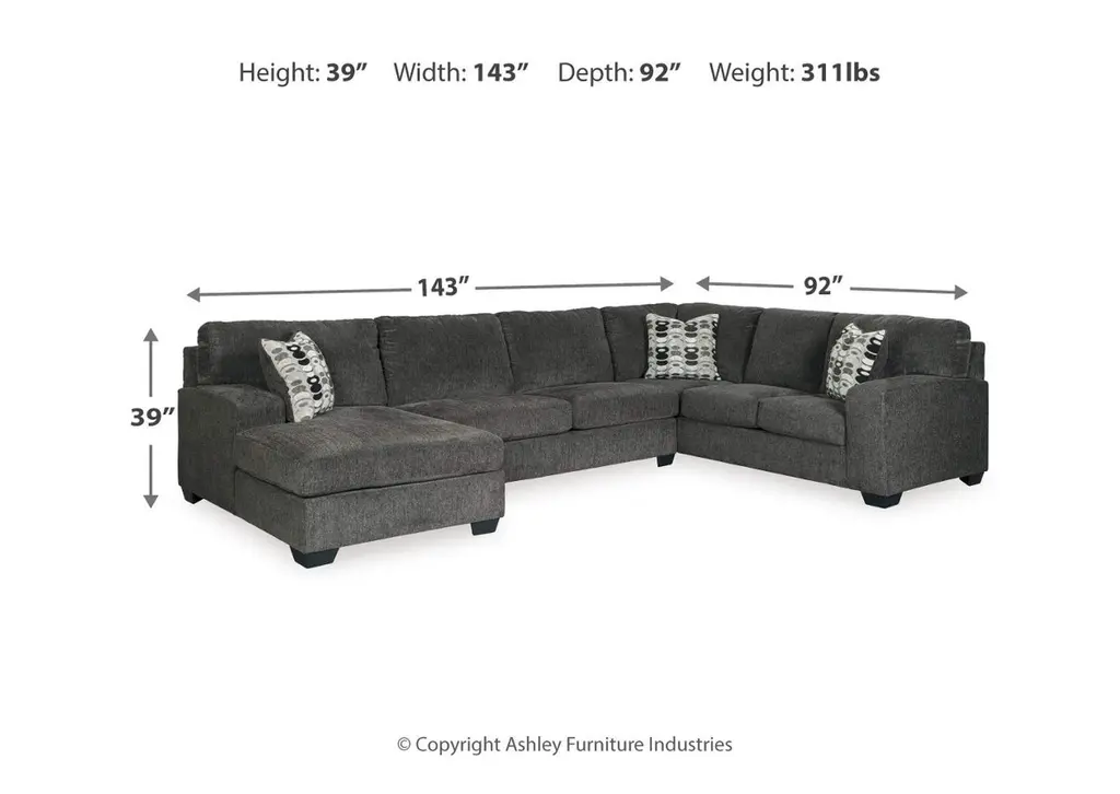A mastery in "less is more," the Ballinasloe sectional manages to make cool, contemporary design so warm and cozy. Its smoky gray upholstery, incredibly plush to the touch, is a new twist on neutral. Gently rounded corners give the clean-lined profile a sense of ease, for a high-style look that’s ultra inviting. Weight 323.000 lbs. (145.35kgs.)