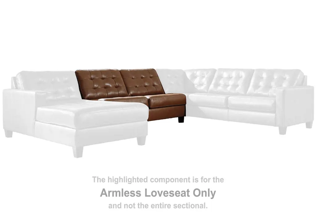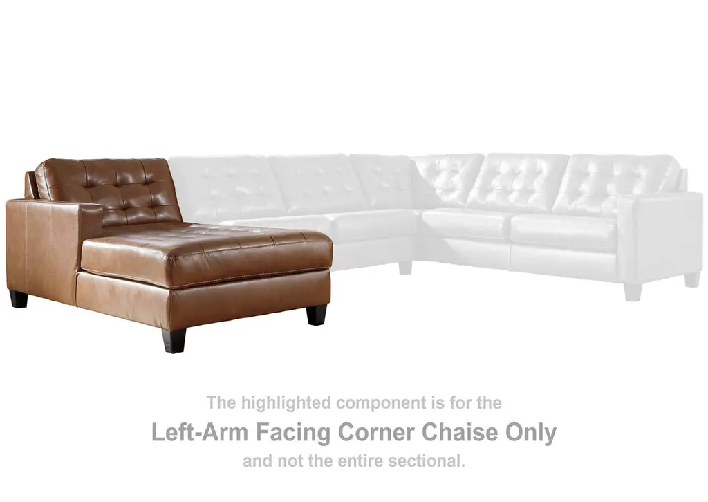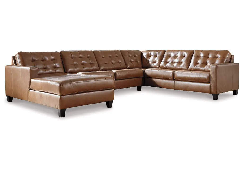 Bask in the beauty of the Baskove sectional. Reserved exclusively for those with an eye for fine contemporary design, this generously scaled sectional in auburn brown is dressed to impress in every way. A combination of leather and faux leather upholstery provides incomparable comfort where it counts. The sleek track armrests, tufted box cushions and sumptuous chaise are the embodiment of luxury. Weight 400.000 lbs. (180kgs.)