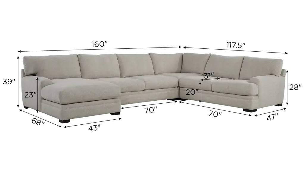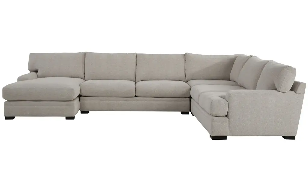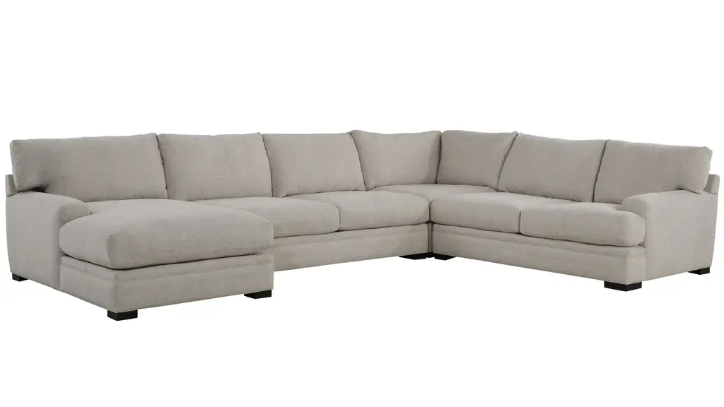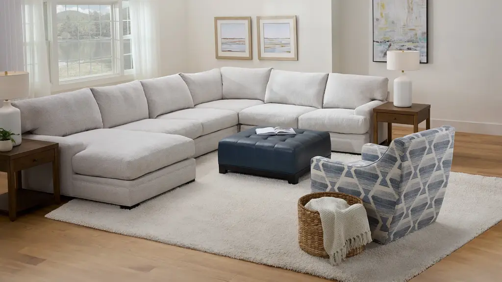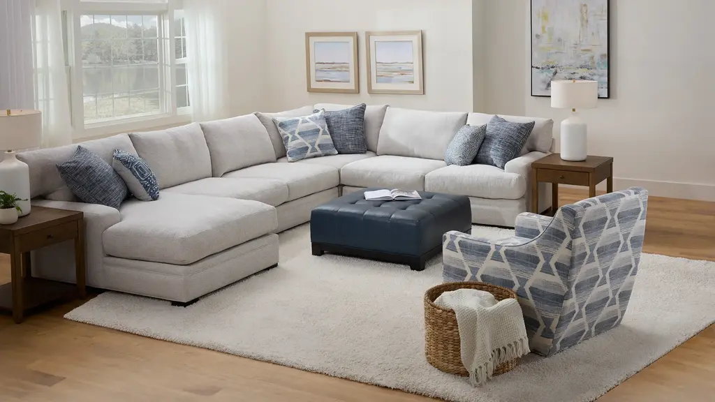 Invite everyone to gather for movie nights, game days, or just relaxing. There's plenty of room to sprawl out in comfort on the Bayside 4-pc. sectional with left arm-facing chaise, armless chair, corner, and right arm-facing loveseat. This oversized beauty also boasts a touch of coastal flair. Cool blue and off-white woven accent pillows in contemporary textures and patterns add the perfect finishing touch for a serene and welcoming living space.