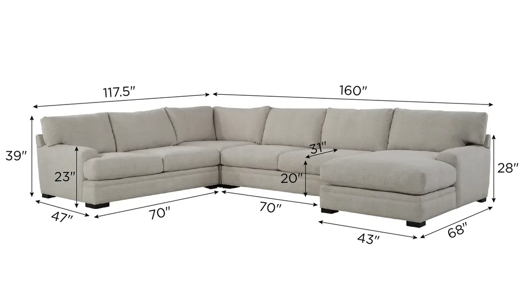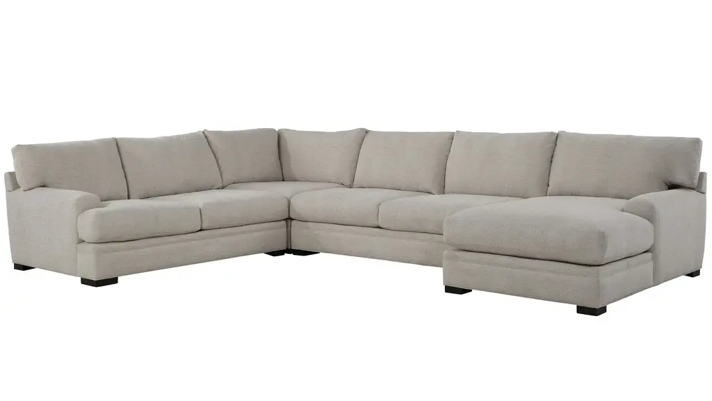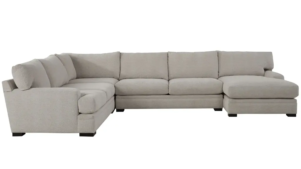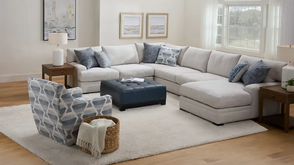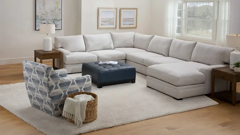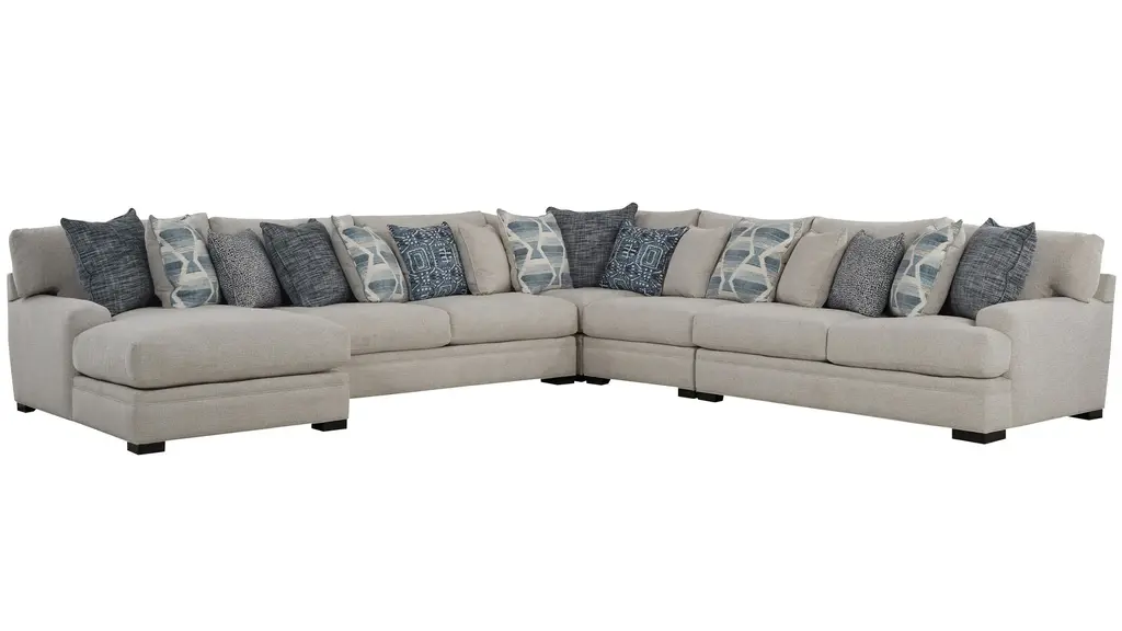 Invite everyone to gather for movie nights, game days, or just relaxing. There's plenty of room to sprawl out in comfort on the Bayside 4-pc. sectional with left arm-facing loveseat, corner, armless chair, and right arm-facing chaise. This oversized beauty also boasts a touch of coastal flair. Cool blue and off-white woven accent pillows in contemporary textures and patterns add the perfect finishing touch for a serene and welcoming living space.