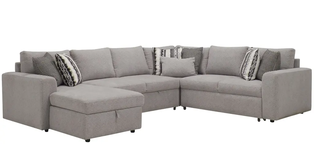 If you're looking for a sectional that's full of style and comfort, you're sure to fall in love with the Bayside 4-pc. Microfiber Sectional Sofa. Soft polyester in trendy gray adorns the sectional while fun woven pattern on the pillows gives your living room a bit of flair. This over-sized sectional seats the whole family making movie night a breeze. The Bayside sectional is a sure fit to your lifestyle.