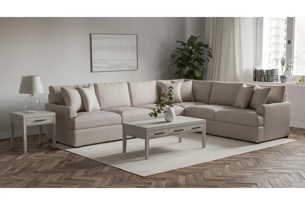 Belinha Ii Taupe Beige Grey Fabric 140" Modular 4 Piece L-Shaped Sectional | Reversible | Track Arms
