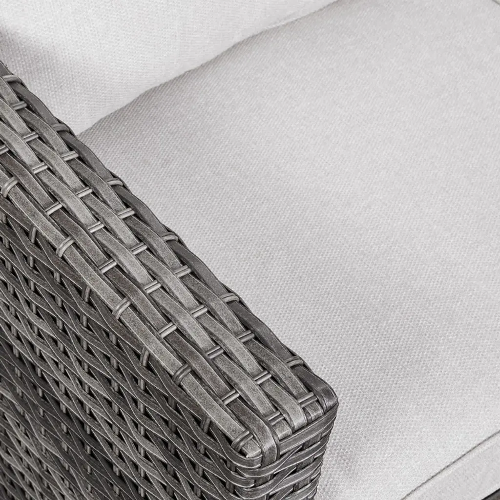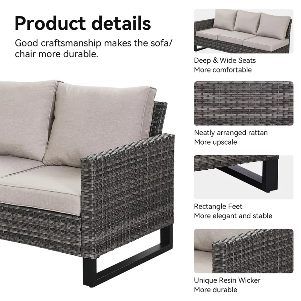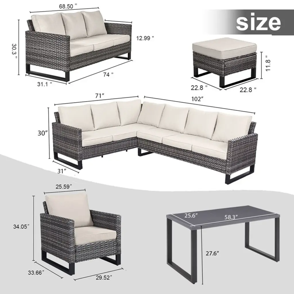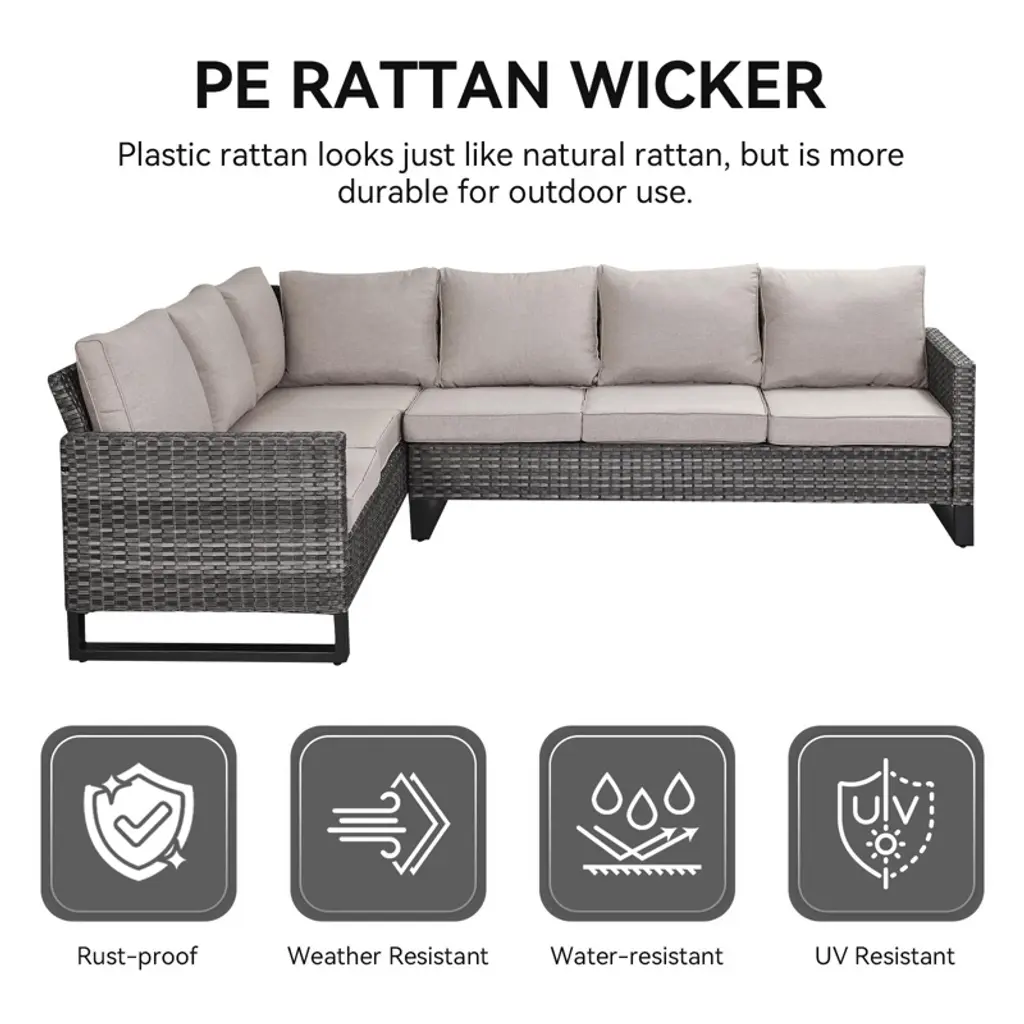 Upgrade your outdoor living space with this premium 9-piece patio furniture set, featuring an L-shaped sectional sofa, a spacious patio couch, two wicker patio chairs, two ottomans, and a stylish coffee table, perfect for lounging or entertaining. Crafted with durable powder-coated steel frames and handwoven all-weather PE wicker, this sectional patio sofa set resists rust, UV rays, and rain for long-lasting use. The plush cushions are filled with 100% stuffed cotton for superior comfort, while the fade-proof, water-resistant olefin fabric covers ensure easy maintenance. Weather-resistant and low-maintenance, this outdoor sectional set combines modern design with practicality, making it ideal for relaxing mornings or lively gatherings. Whether hosting summer BBQs or enjoying a quiet evening under the stars, this complete set delivers both style and durability for your outdoor oasis.