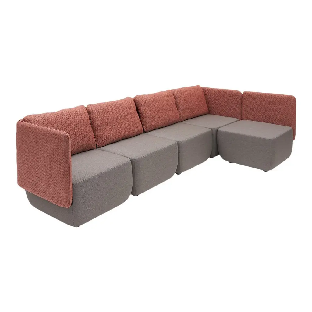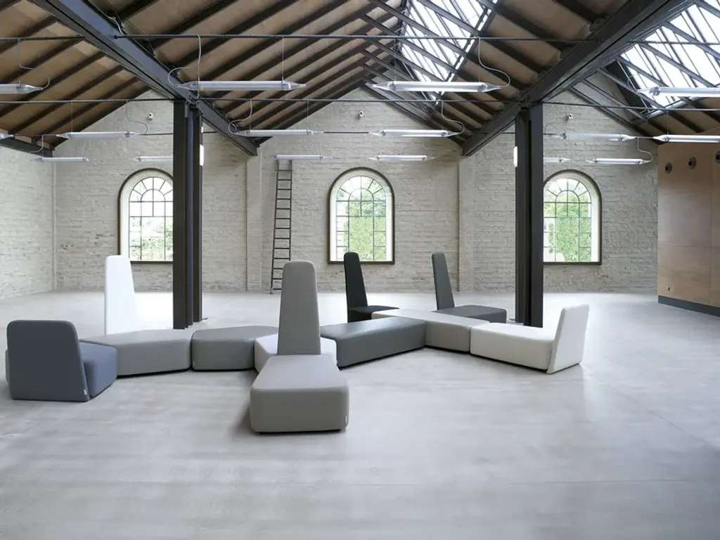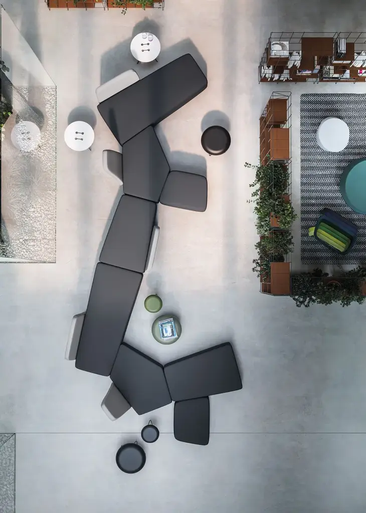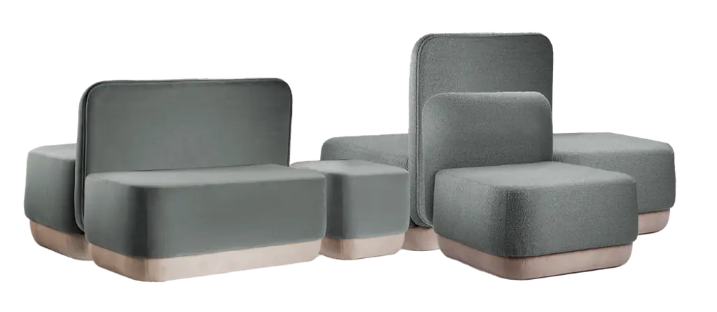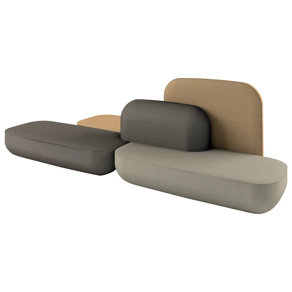 Seating system which allows to create several shapes simply positioning the various modules side by side and creating quite different situations and atmospheres. Metal supporting structure and elastic belts. High density polyurethane padding. The backrests are modular and can be used on all sides of the seat by means of the underneath positioned runners. Ideal for community spaces. MATERIALS AND FINISHES Seat structure: plywood and elastic belts. Back Structure: metal. Upholstered/Padding: high density polyurethane. Cover: removable fabric cover.