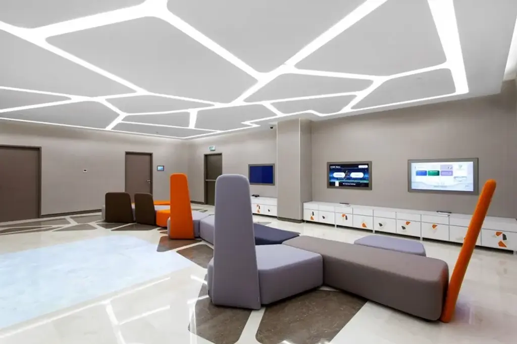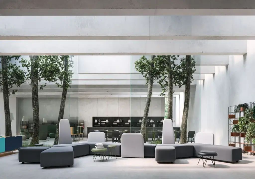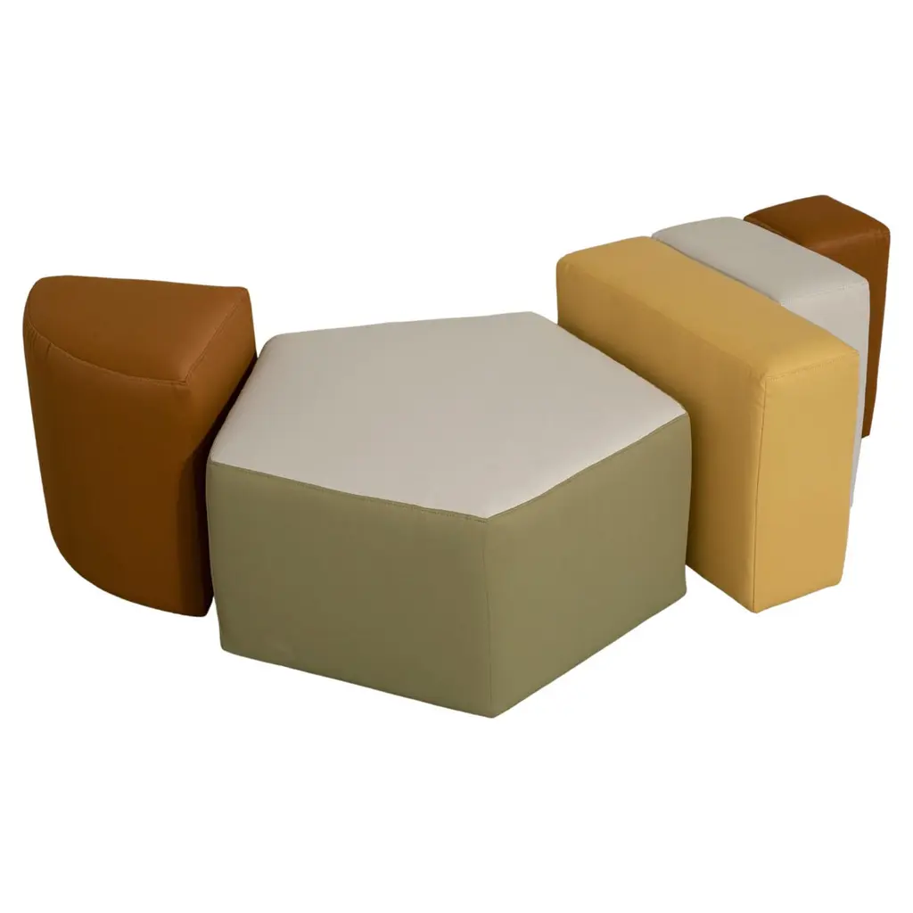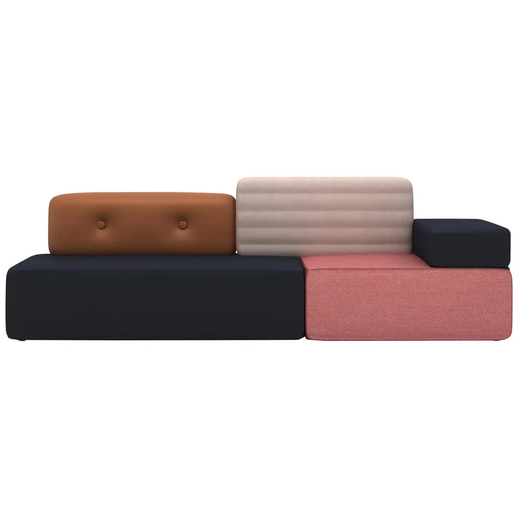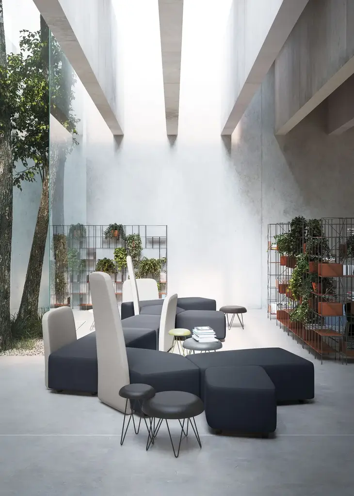 Seating system which allows to create several shapes simply positioning the various modules side by side and creating quite different situations and atmospheres. Metal supporting structure and elastic belts. High density polyurethane padding. The backrests are modular and can be used on all sides of the seat by means of the underneath positioned runners. Ideal for community spaces. MATERIALS AND FINISHES Seat structure: plywood and elastic belts. Back Structure: metal. Upholstered/Padding: high density polyurethane. Cover: removable fabric cover.