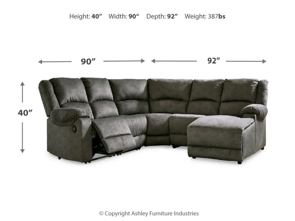 With plush cushions and wraparound pillow top arms, the Benlocke sectional takes comfort to a whole new level. Its herringbone-patterned velvet upholstery requires minimal care, ma this relaxation station ideal for homes with children and pets. The reclining feature engages with the pull of a tab, putting pleasure and instant relaxation at your fingertips.
